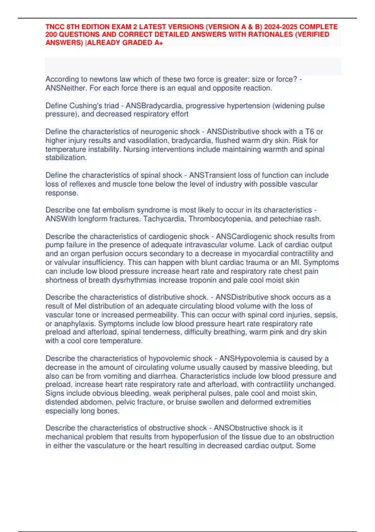 TNCC 8TH EDITION EXAM 2 LATEST VERSIONS (VERSION A & B) COMPLETE 200 QUESTIONS AND CORRECT DETAILED ANSWERS WITH RATIONALES (VERIFIED ANSWERS) ALREADY GRADED A+