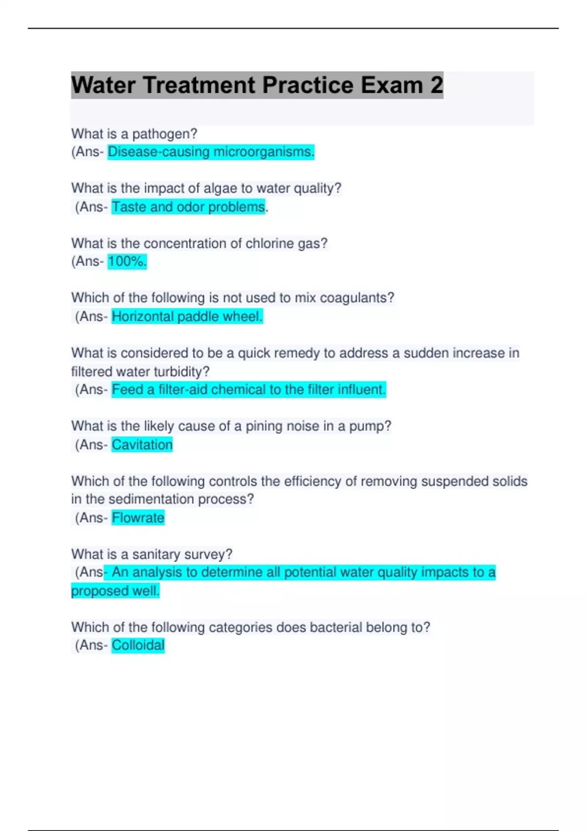 Water Treatment Practice Exam 2: Questions & Answers: UPdated