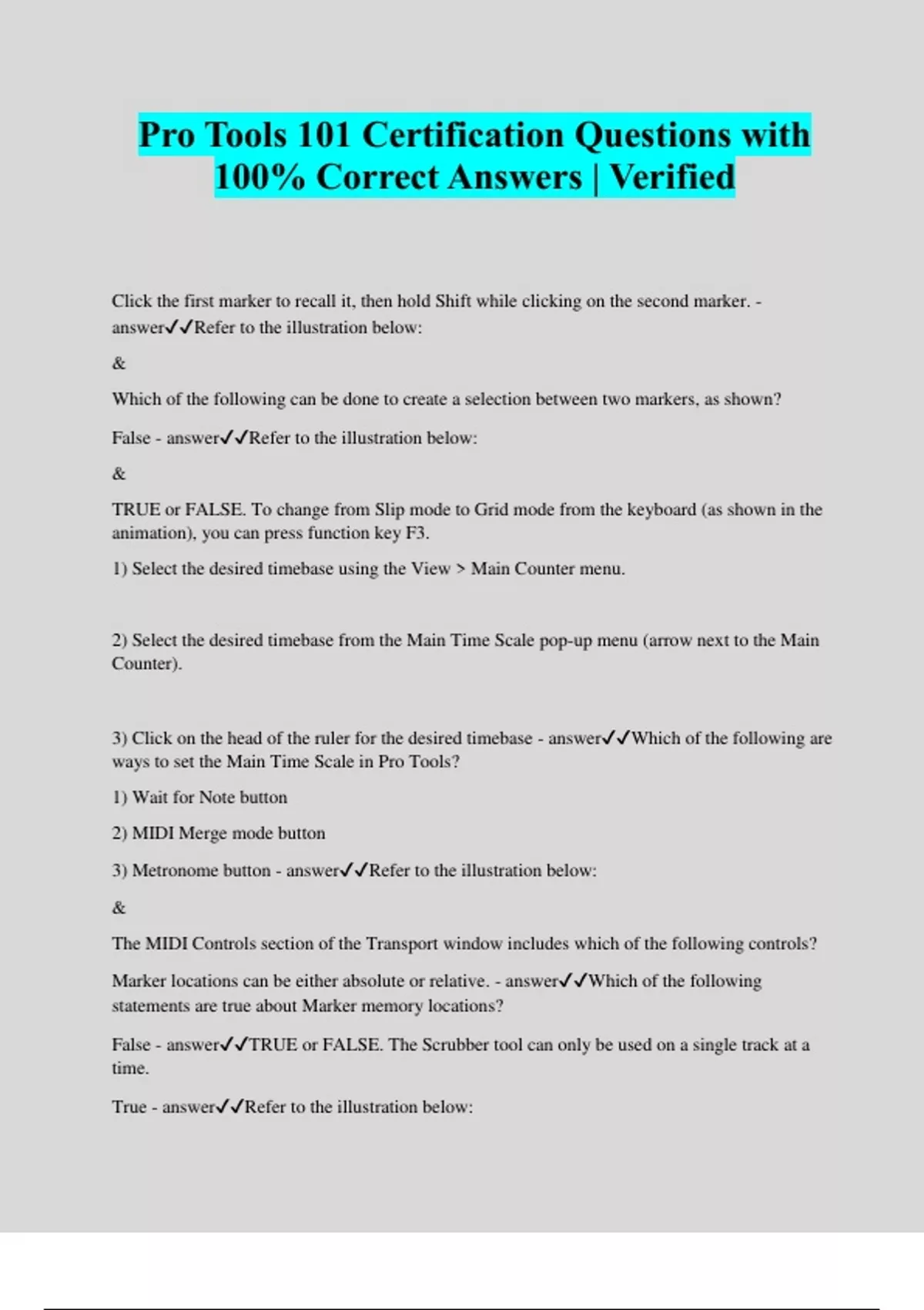 Pro Tools 101 Certification Questions with 100% Correct Answers | Verified Click the first marker to recall it, then hold Shift while clicking on the second marker. - answerRefer to the illustration below: & Which of the following can be done to create a selection between two markers, as shown? False - answerRefer to the illustration below: & TRUE or FALSE. To change from Slip mode to Grid mode from the keyboard (as shown in the animation), you can press function key F3. 1) Select the desired timebase using the View Main Counter menu. 2) Select the desired timebase from the Main Time Scale pop-up menu (arrow next to the Main Counter). 3) Click on the head of the ruler for the desired timebase - answerWhich of the following are ways to set the Main Time Scale in Pro Tools? 1) Wait for Note button 2) MIDI Merge mode button 3) Metronome button - answerRefer to the illustration below: & The MIDI Controls section of the Transport window includes which of the following controls? Marker locations can be either absolute or relative. - answerWhich of the following statements are true about Marker memory locations? False - answerTRUE or FALSE. The Scrubber tool can only be used on a single track at a time. True - answerRefer to the illustration below