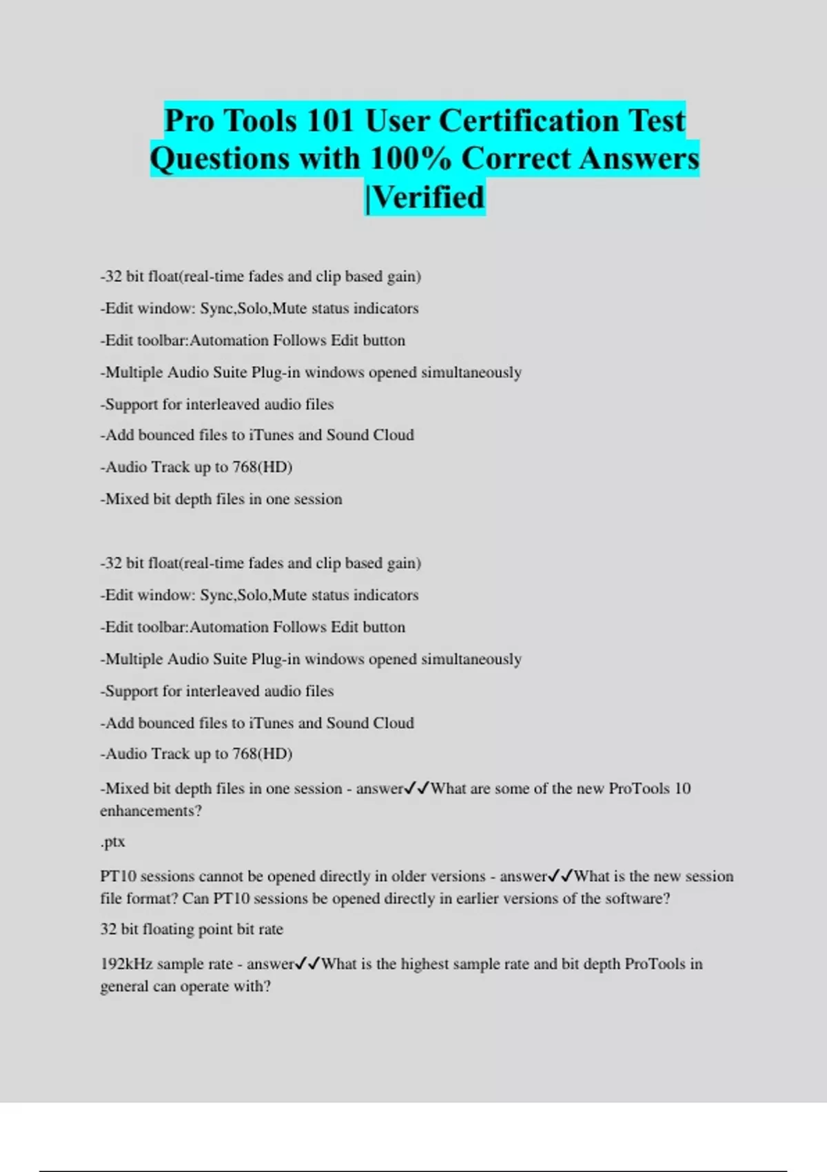 Pro Tools 101 User Certification Test Questions with 100% Correct Answers |Verified -32 bit float(real-time fades and clip based gain) -Edit window: Sync,Solo,Mute status indicators -Edit toolbar:Automation Follows Edit button -Multiple Audio Suite Plug-in windows opened simultaneously -Support for interleaved audio files -Add bounced files to iTunes and Sound Cloud -Audio Track up to 768(HD) -Mixed bit depth files in one session -32 bit float(real-time fades and clip based gain) -Edit window: Sync,Solo,Mute status indicators -Edit toolbar:Automation Follows Edit button -Multiple Audio Suite Plug-in windows opened simultaneously -Support for interleaved audio files -Add bounced files to iTunes and Sound Cloud -Audio Track up to 768(HD) -Mixed bit depth files in one session - answerWhat are some of the new ProTools 10 enhancements? .ptx PT10 sessions cannot be opened directly in older versions - answerWhat is the new session file format? Can PT10 sessions be opened directly in earlier versions of the software? 32 bit floating point bit rate 192kHz sample rate - answerWhat is the highest sample rate and bit depth ProTools in general can operate with?