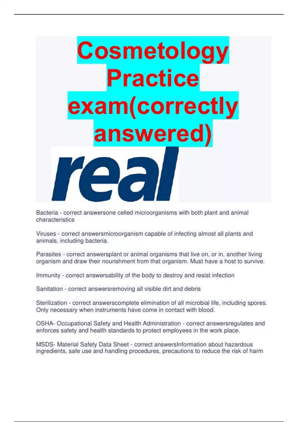 Cosmetology Practice exam(correctly answered) Bacteria - correct answersone celled microorganisms with both plant and animal characteristics Viruses - correct answersmicroorganism capable of infecting almost all plants and animals, including bacteria. Parasites - correct answersplant or animal organisms that live on, or in, another living organism and draw their nourishment from that organism. Must have a host to survive. Immunity - correct answersability of the body to destroy and resist infection Sanitation - correct answersremoving all visible dirt and debris Sterilization - correct answerscomplete elimination of all microbial life, including spores. Only necessary when instruments have come in contact with blood. OSHA- Occupational Safety and Health Administration - correct answersregulates and enforces safety and health standards to protect employees in the work place. MSDS- Material Safety Data Sheet - correct answersInformation about hazardous ingredients, safe use and handling procedures, precautions to reduce the risk of harm and over exposure, flammability and dada incase of fire, proper disposal guidelines and medical information in case a reaction to product occurs. EPA- Environmental Protection Agency - correct answersLicenses two types of disinfectants used in salons; Tuberculocidal, and Hospital. Hospital products are safe for cleaning blood and body fluids, Tuberculocidal disinfectants are proven to kill the bacteria that cause tuberculosis, which is more difficult to kill. FDA- Food and drug administration - correct answersProhibits sale of antifungal products for finger and toenails without a medical prescription. Universal Precautions - correct answersa set of guidelines published by OSHA that require the employer and the employee to assume that all human blood and body fluids are infectious for bloodborne pathogens. Cells - correct answersthe basic units of all living thing, from bacteria to plants and animals, and including human beings Protoplasm - correct answerscolorless jelly like substance in cells in which food elements such as protein, fats, carbohydrates, mineral salts and water are present Nucleus - correct answersThe dense, active protoplasm found in the center of the cell. cytoplasm - correct answersAll the protoplasm of a cell that surrounds the nucleus Cell membrane - correct answersthin, flexible barrier that surrounds all cells; regulates what enters and leaves the cell Mitosis - correct answersThe reproduction process in which cells divide into two identical cells called daughter cells. Metabolism - correct answersset of chemical reactions through which an organism builds up or breaks down materials as it carries out its life processes anabolism - correct answersProcess of building up complex materials (proteins) from simple materials Catabolism - correct answersbreakdown of more complex substances into simpler ones with release of energy Tissue - correct answersgroup of similar cells that perform a particular function Heart - correct answersCirculates the blood Lungs - correct answersSupply Oxygen to the blood Skin - correct answersforms external protective covering of the body Skeletal system - correct answersthe physical foundation of the body. It is composed of 206 bones that vary in size and shame and are connected by moveable and immovable joints. Circulatory system - correct answersbody system consisting of the heart and blood vessels that circulate blood through the body Endocrine system - correct answersaffects the growth, development, sexual activities, and health of the entire body. Excretory System - correct answersgroup of organs including the kidneys, liver, skin, large intestine and lungs that purify the body by the elimination of waste matter Integumentary System - correct answersServes as a protective covering and helps in regulating the body's temperature; consists of skin, accessory organs such as oil and sweat glands, sensory receptors, hair, and nails. Muscular System - correct answersCovers, shapes, and supports the skeleton tissue; also contracts and moves various parts of the body nervous System - correct answerscontrols and coordinates all other systems and makes them work harmoniously and efficiently; consists of brain, spinal cord, and nerves. respiratory system - correct answerssystem responsible for taking in oxygen and releasing carbon dioxide using the lungs Occipital bone - correct answershindmost bone of the skull, below the parietal bones; forms the back of the skull above the nape. Parietal bones - correct answersbones that form the sides and top of the cranium Frontal bone - correct answersforms the forehead Temporal bones - correct answersbones forming the sides of the head in the ear region ethmoid bone - correct answersLight spongy bone between the eye sockets and forms part of the nasal cavities. sphenoid bone - correct answersjoins all of the bones of the cranium together lacrimal bones - correct answersSmall, thin bones located at the front inner wall of the orbits (eye sockets). maxillae bone - correct answersbones of the upper jaw