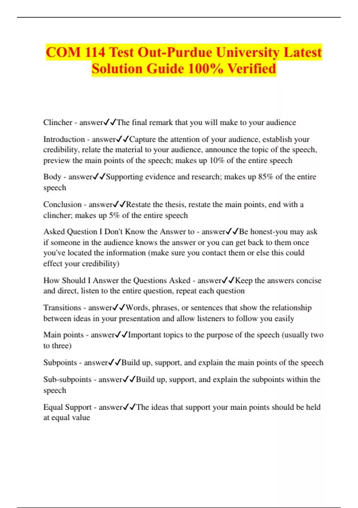 COM 114 Test Out-Purdue University Latest Solution Guide 100% Verified Clincher - answerThe final remark that you will make to your audience Introduction - answerCapture the attention of your audience, establish your credibility, relate the material to your audience, announce the topic of the speech, preview the main points of the speech; makes up 10% of the entire speech Body - answerSupporting evidence and research; makes up 85% of the entire speech Conclusion - answerRestate the thesis, restate the main points, end with a clincher; makes up 5% of the entire speech Asked Question I Don't Know the Answer to - answerBe honest-you may ask if someone in the audience knows the answer or you can get back to them once you've located the information (make sure you contact them or else this could effect your credibility) How Should I Answer the Questions Asked - answerKeep the answers concise and direct, listen to the entire question, repeat each question Transitions - answerWords, phrases, or sentences that show the relationship between ideas in your presentation and allow listeners to follow you easily Main points - answerImportant topics to the purpose of the speech (usually two to three