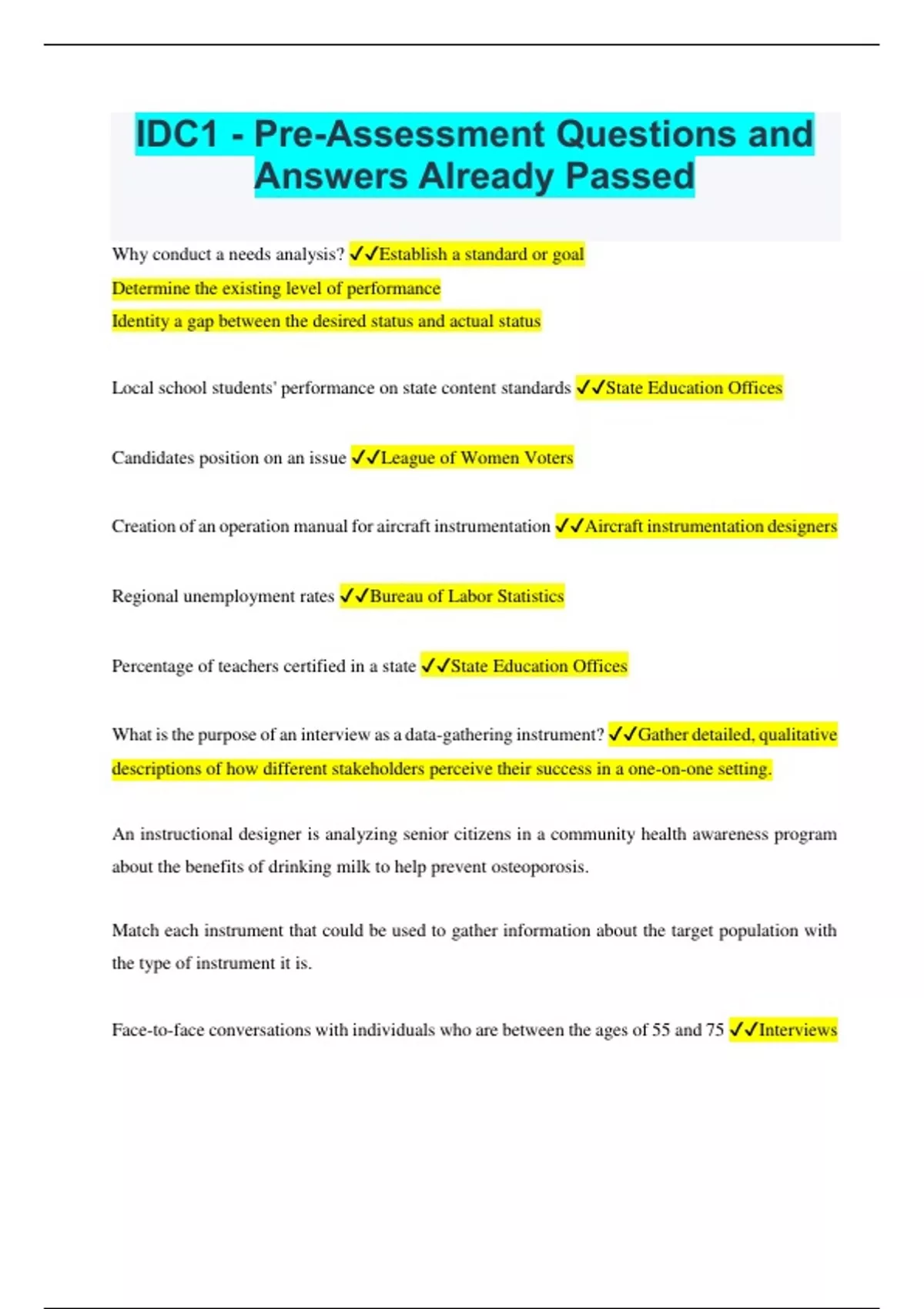 Why conduct a needs analysis? Establish a standard or goal Determine the existing level of performance Identity a gap between the desired status and actual status Local school students' performance on state content standards State Education Offices Candidates position on an issue League of Women Voters Creation of an operation manual for aircraft instrumentation Aircraft instrumentation designers Regional unemployment rates Bureau of Labor Statistics Percentage of teachers certified in a state State Education Offices What is the purpose of an interview as a data-gathering instrument? Gather detailed, qualitative descriptions of how different stakeholders perceive their success in a one-on-one setting. An instructional designer is analyzing senior citizens in a community health awareness program about the benefits of drinking milk to help prevent osteoporosis. Match each instrument that could be used to gather information about the target population with the type of instrument it is. Face-to-face conversations with individuals who are between the ages of 55 and 75 Interviews