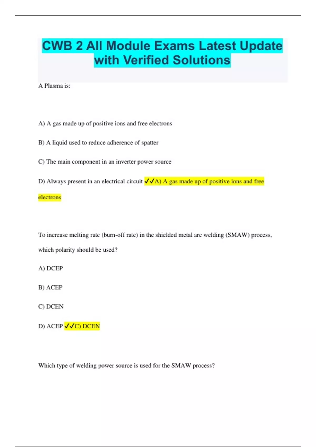 CWB 2 All Module Exams Latest Update with Verified Solutions A Plasma is: A) A gas made up of positive ions and free electrons B) A liquid used to reduce adherence of spatter C) The main component in an inverter power source D) Always present in an electrical circuit A) A gas made up of positive ions and free electrons To increase melting rate (burn-off rate) in the shielded metal arc welding (SMAW) process, which polarity should be used? A) DCEP B) ACEP C) DCEN D) ACEP C) DCEN Which type of welding power source is used for the SMAW process? A) Constant Current B) Constant Voltage C) Pulsed Current D) Pulsed Voltage A) Constant Current The purpose of a drooping welding power source is to produce: A) Constant voltage regardless of the current demand B) Constant arc length regardless of current C) Nearly constant current regardless of voltage fluctuations B) Low open circuit voltage C) Nearly constant current regardless of voltage fluctuations A self-regulating welding arc is produced by a: A) Constant current power source with a constant speed wire feed system B) Constant voltage power source with a voltage sensing wire feed system C) Constant current power source D) Constant voltage power source with a constant speed wire feed system D) Constant voltage power source with a constant speed wire feed system Short circuit current is determined by the: A) Voltage in the circuit B) Static characteristic of the power source C) Position of welding D) Skill of the welder B) Static characteristic of the power source A Transformer is a device that: A) Transforms AC to DC B) Works only to change a DC voltage C) Changes the value of an AC voltage but does not change the frequency D) Is made from a semiconductor C) Changes the value of an AC voltage but does not change the frequency A Rectifier is a device that converts: A) DC current to AC current B) AC Current to a high value DC current C) DC current to a high value DC current D)