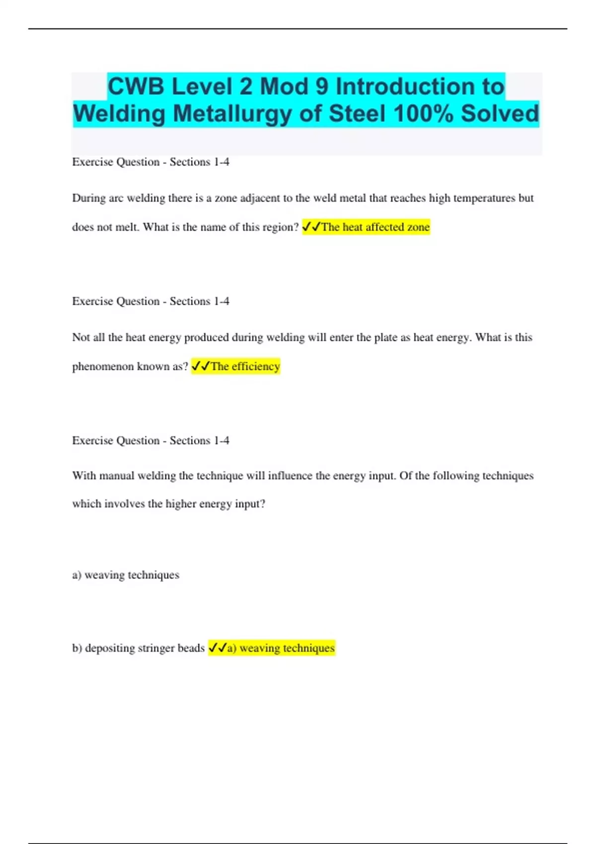 CWB Level 2 Mod 9 Introduction to Welding Metallurgy of Steel 100% Solved Exercise Question - Sections 1-4 During arc welding there is a zone adjacent to the weld metal that reaches high temperatures but does not melt. What is the name of this region? The heat affected zone Exercise Question - Sections 1-4 Not all the heat energy produced during welding will enter the plate as heat energy. What is this phenomenon known as? The efficiency Exercise Question - Sections 1-4 With manual welding the technique will influence the energy input. Of the following techniques which involves the higher energy input? a) weaving techniques b) depositing stringer beads a) weaving techniques Exercise Question - Sections 1-4 Considering that increasing the heat input will reduce the cooling rate, is the following statement true or false? For thick plates, the cooling rate is inversely proportional to the heat input True Exercise Question - Sections 4-8 The metallurgical changes that occur in the HAZ will be dependent on the peak _______________. The peak temperature reached Exercise Question - Sections 4-8 Regions that are close to the fusion boundary can experience temperatures sufficiently high enough that growth of the ___________________________________occurs. Austenitic grains Exercise Question - Sections 4-8 True or False One feature off hydrogen cracking is that it only occurs when the weld and heat affected zone are at high temperatures? False Exercise Question - Sections 4-8 True or False Welding over a gap in the backing bar of a complete penetration groove weld may result in a transverse crack in the weld metal? True Exercise Question - Sections 9-12 In the heat affected zone of a weld in carbon steel, fast cooling rates will form a hard ________________________________? Martensitic structure Exercise Question - Sections 9-12 Which of the following types of steel is the least susceptible to hydrogen cracking in normal circumstances? a) high strength, high hardness steels b) low strength, low hardness steels c) all steels have the same susceptibility to hydrogen cracking b) low strength, low hardness steels Exercise Question - Sections 9-12 True or False The carbon equivalent formula available in CSA W59 is one of several possible formulas available. True Exercise Question - Sections 9-12 Which cracking susceptibility test uses plates of different thicknesses to change the cooling rate? Controlled Thermal Severity Exercise Question - Sections 13-17 True or False Solidified weld metal will have a micro-structure the same as that of the parent material (plate) False Exercise Question - Sections 13-17 The proportion of parent metal melted into weld is known as the _______________________________ Dilution Exercise Question - Sections 13-17 Arc fluxes that do not easily transfer oxygen to the weld metal are referred to as what type of flux? Basic Fluxes Exercise Question - Sections 18-22 What effect does the presence of large quantities of oxides have on the charpy- V- notch impact energy? It is likely to be lower Exercise Question - Sections 18-22 What type of weld pool does high welding speed produce? A long weld pool Exercise Question - Sections 18-22 Centreline solidification cracking is most likely caused by welding speed that is too: a) high b) low a) high Exercise Question - Sections 18-22 When a carbon steel weldment is stress relieved at 625 Celsius are there any major changes in the micro-structure? No