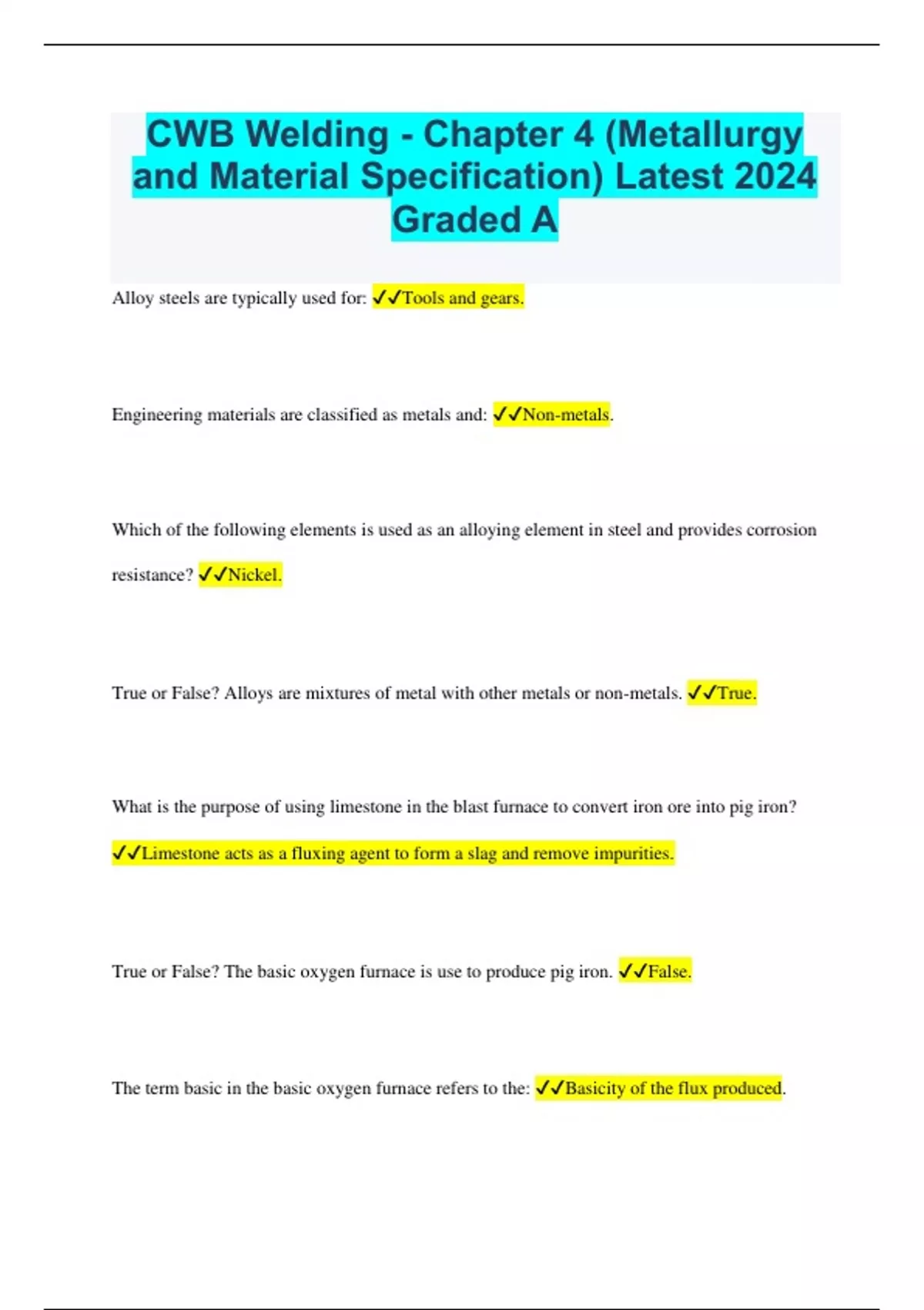 CWB Welding - Chapter 4 (Metallurgy and Material Specification) Latest 2024 Graded A