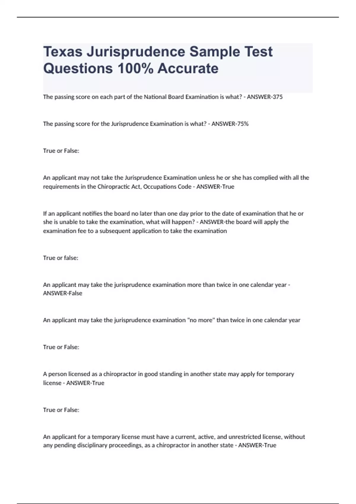 The passing score for the Jurisprudence Examination is what? - ANSWER-75% True or False: An applicant may not take the Jurisprudence Examination unless he or she has complied with all the requirements in the Chiropractic Act, Occupations Code - ANSWER-True If an applicant notifies the board no later than one day prior to the date of examination that he or she is unable to take the examination, what will happen? - ANSWER-the board will apply the examination fee to a subsequent application to take the examination True or false: An applicant may take the jurisprudence examination more than twice in one calendar year - ANSWER-False An applicant may take the jurisprudence examination "no more" than twice in one calendar year True or False: A person licensed as a chiropractor in good standing in another state may apply for temporary license - ANSWER-True True or False: An applicant for a temporary license must have a current, active, and unrestricted license, without any pending disciplinary proceedings, as a chiropractor in another state - ANSWER-True