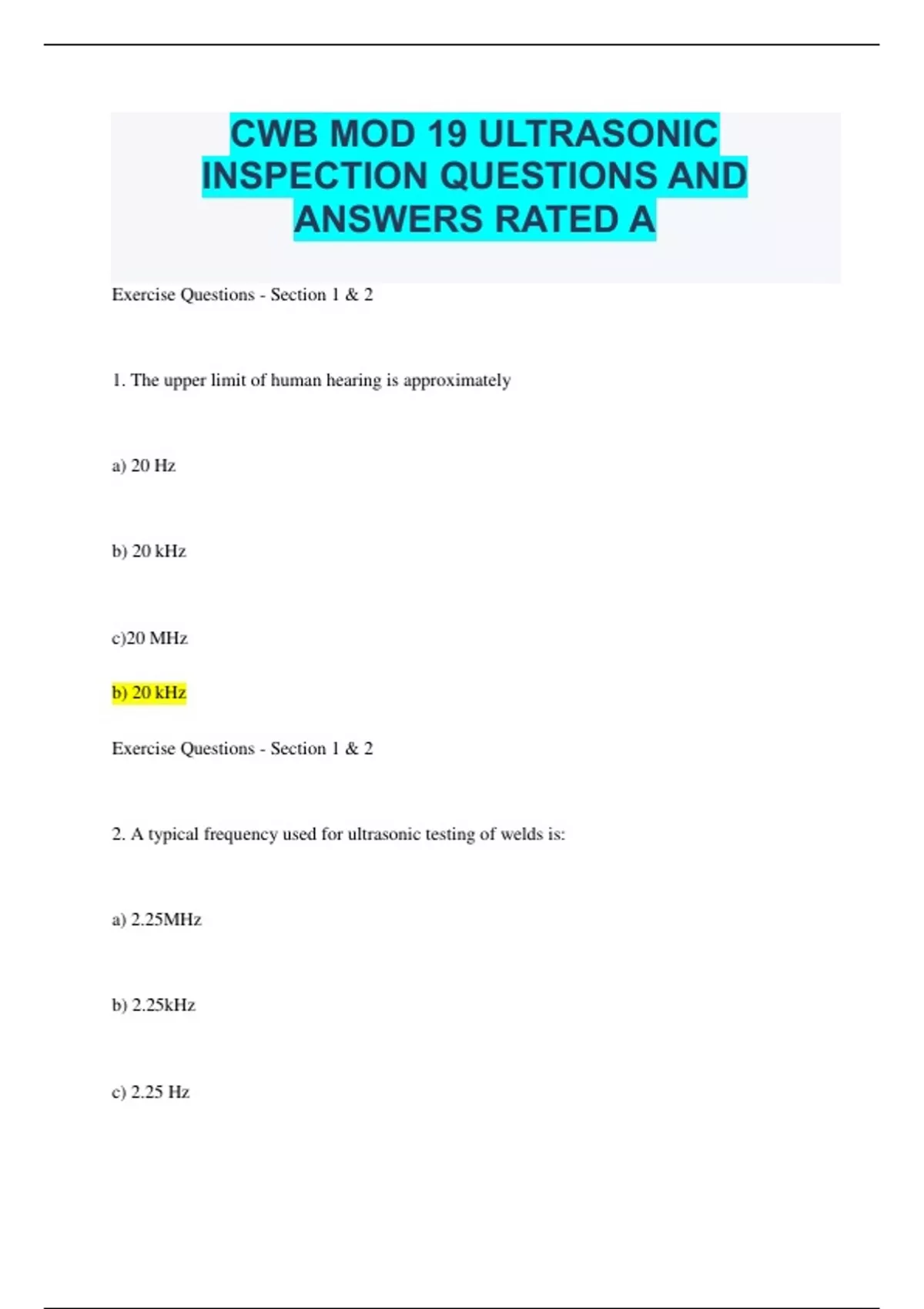 CWB MOD 19 ULTRASONIC INSPECTION QUESTIONS AND ANSWERS RATED A Exercise Questions - Section 1 & 2 1. The upper limit of human hearing is approximately a) 20 Hz b) 20 kHz c)20 MHz b) 20 kHz Exercise Questions - Section 1 & 2 2. A typical frequency used for ultrasonic testing of welds is: a) 2.25MHz b) 2.25kHz c) 2.25 Hz a) 2.25MHz Exercise Questions - Section 1 & 2 3. If an ultrasonic wave in a block of steel has a wavelength of 1.3 mm and travels at a velocity of 5.85 x 10 power of 3 m/s. What is the frequency? 4.5MHz Exercise Questions - Section 1 & 2 4. Do transverse waves in a solid travel faster or slower than longitudinal waves? slower Exercise Questions - Section 1 & 2 5. True or False The energy carried by a wave is proportional to the square of the amplitude True Exercise Questions - Section 1 & 2 6. If the amplitude of a wave is reduced to 25%, what is the corresponding drop in dB? (Hint: you can figure it out from the information in section 2.5 but you could also use logarithm tables or a calculator) 12dB Exercise Questions - Section 1 & 2 7. The decrease in energy of an ultrasonic wave as it travels through a material is known as: a) amplitude b) amplification c) attenuation c) attenuation Exercise Questions - Section 1 & 2 8. Piezoelectric crystals can: a) change mechanical pulses into electrical pulses b) change electrical pulses into mechanical pulses c) both (a) and (b) c) both