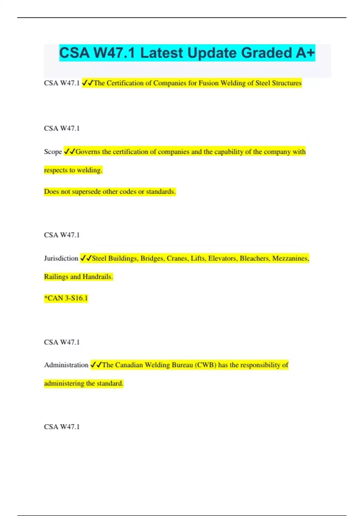 CSA W47.1 Latest Update Graded A+ CSA W47.1 The Certification of Companies for Fusion Welding of Steel Structures CSA W47.1 Scope Governs the certification of companies and the capability of the company with respects to welding. Does not supersede other codes or standards. CSA W47.1 Jurisdiction Steel Buildings, Bridges, Cranes, Lifts, Elevators, Bleachers, Mezzanines, Railings and Handrails. *CAN 3-S16.1 CSA W47.1 Administration The Canadian Welding Bureau (CWB) has the responsibility of administering the standard. CSA W47.1 Areas of Interest to Welders The company must submit, at the time intervals and to the extent required by the bureau, a report showing: -the name of each tack welder, welder and welding operator; -the process and welding position upon which each may be engaged; -the expiry date of qualification; and qualifying authority, if other than the bureau. CSA W47.1 Performance Qualification Testing Requirements -Welding personnel shall be permitted to weld only in the classification, class, thickness range and process in which they are qualified. -A successful test results in an I.D. card according to classification, process and mode of application. *When a welder's ability is questioned they shall have their qualification suspended immediately until they pass a test check to be recertified. CSA W47.1 Classification "T" Refers to a welder/operator's ability to perform a weld from 1 side without backing and achieve complete penetration in the root pass, hollow section, pipe and plate. *This classification also qualifies for the S, FW, and WT classifications in the same process, class and mode. CSA W47.1 Classification "S" Refers to a welder/operator's ability to weld plates and rolled or hollow sections for the full thickness of material, when welding from both sides with back gouging, or when welding from one side with backing. CSA W47.1 Classification "FW" Refers to a welder/operator's ability to deposit fillet welds and tack welds. CSA W47.1 Classification "ASW" Refers to a welder's ability to deposit Arc Spot Welds. CSA W47.1 Classification "WT" Refers to a welder's ability to deposit tack welds. CSA W47.1 Processes SMAW (Shielded Metal Arc Welding) FCAW (Flux Core Arc Welding) GMAW (Gas Metal Arc Welding) SAW (Submerged Arc Welding) GTAW (Gas Tungsten Arc Welding) ESW (Electro Slag Welding) EGW (Electro Gas Welding) Each process requires its own qualification. *Separate qualification tests are required if the mode of transfer changes to ensure the welder is capable of using GMAW in various modes without issue. CSA W47.1 Modes of Process Application Manual Welding Semi-Automatic Welding Machine Welding and Automatic CSA W47.1 Operator Class and Position of Welding Class F - Flat: capable of welding in the flat position and able to make fillet welds in the horizontal position. Class H - Horizontal: capable of welding in the flat and horizontal positions. Class V - Vertical: capable of welding in the flat, horizontal and vertical positions. Class O - Overhead: capable of welding in the flat, horizontal, vertical and overhead positions. CSA W47.1 Test Conditions -Must consist of a fillet weld, groove plus fillet welds or other types of welds as applicable, executed with the applicable welding process in qualifying positions. -Vertical shall normally be vertical up. -SMAW uses F number designations: F1 = EXX15, EXX16, EXX18 -qualifies F1 F2 = EXX10, EXX11 -qualifies F1, F2 F3 = EXX12, EXX13, EXX14 -qualifies F1, F2, F3 F4 = EXX22, EXX24, EXX27, EXX28 -qualifies F1, F2, F3, F4 -Tests must be witnessed and evaluated by the CWB. CSA W47.1 Period of Effectiveness Shall remain in affect for 2 years unless there is a specific reason to question their ability. CSA W47.1 Test Methods -Radiographic examinations may be used at the discretion of the company for all processes except semi-automatic GMAW, in which only bend tests may be used. -Surface discontinuities shall not exceed: a) 3 mm (1/8 in) measured in any direction b) 6mm (1/4 in) on the corners, unless the corner crack resulted in visible slag inclusions or other fusion type discontinuities, in which case (a) shall apply. -The sum of all discontinuities >1 mm but < or = 3mm (1/8 in) shall not exceed 10 mm (3/8 in).
