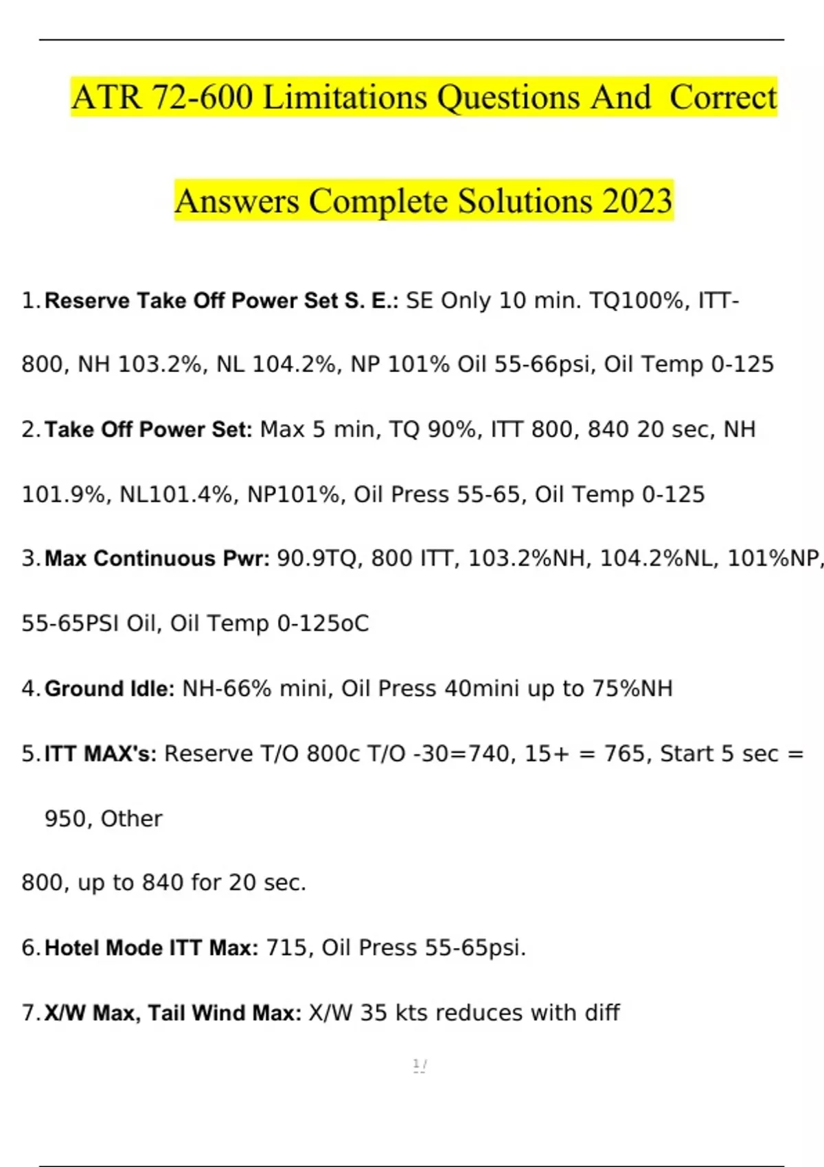 ATR 72-600 Limitations Questions And Answers Complete Solutions 2023