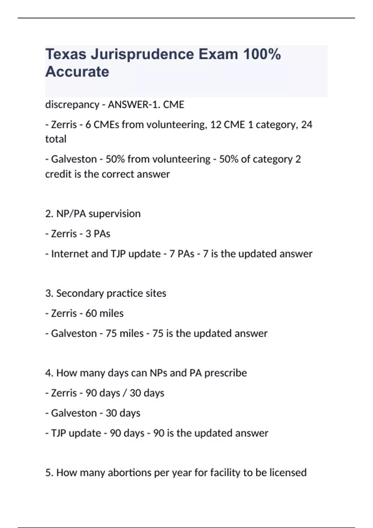 discrepancy - ANSWER-1. CME - Zerris - 6 CMEs from volunteering, 12 CME 1 category, 24 total - Galveston - 50% from volunteering - 50% of category 2 credit is the correct answer 2. NP/PA supervision - Zerris - 3 PAs - Internet and TJP update - 7 PAs - 7 is the updated answer 3. Secondary practice sites - Zerris - 60 miles - Galveston - 75 miles - 75 is the updated answer 4. How many days can NPs and PA prescribe - Zerris - 90 days / 30 days - Galveston - 30 days - TJP update - 90 days - 90 is the updated answer 5. How many abortions per year for facility to be licensed - Zerris - 50/year - Galveston - 100/year (p. 346