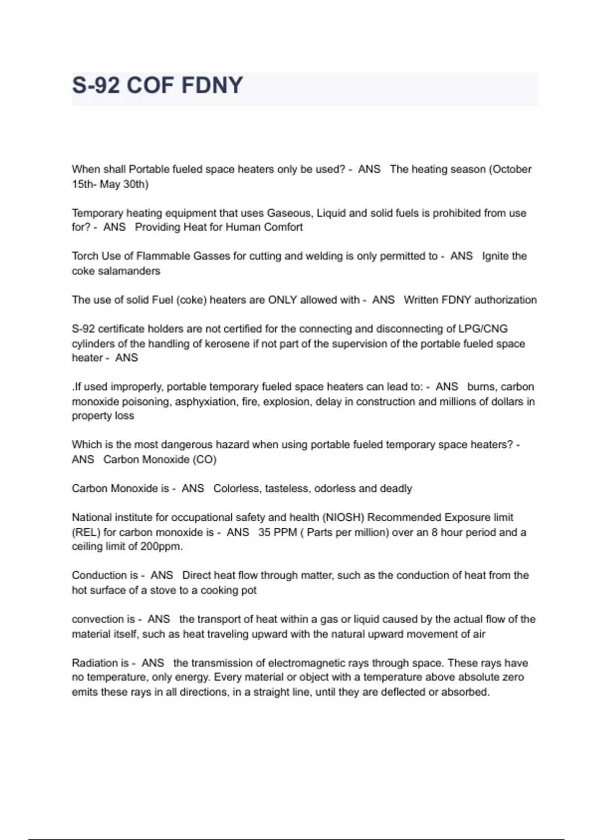 S-92 COF FDNY Exam Questions And Answers When shall Portable fueled space heaters only be used? - ANS The heating season (October 15th- May 30th) Temporary heating equipment that uses Gaseous, Liquid and solid fuels is prohibited from use for? - ANS Providing Heat for Human Comfort Torch Use of Flammable Gasses for cutting and welding is only permitted to - ANS Ignite the coke salamanders The use of solid Fuel (coke) heaters are ONLY allowed with - ANS Written FDNY authorization S-92 certificate holders are not certified for the connecting and disconnecting of LPG/CNG cylinders of the handling of kerosene if not part of the supervision of the portable fueled space heater - ANS .If used improperly, portable temporary fueled space heaters can lead to: - ANS burns, carbon monoxide poisoning, asphyxiation, fire, explosion, delay in construction and millions of dollars in property loss Which is the most dangerous hazard when using portable fueled temporary space heaters? - ANS Carbon Monoxide (CO) Carbon Monoxide is - ANS Colorless, tasteless, odorless and deadly National institute for occupational safety and health (NIOSH) Recommended Exposure limit (REL) for carbon monoxide is - ANS 35 PPM ( Parts per million) over an 8 hour period and a ceiling limit of 200ppm. Conduction is - ANS Direct heat flow through matter, such as the conduction of heat from the hot surface of a stove to a cooking pot convection is - ANS the transport of heat within a gas or liquid caused by the actual flow of the material itself, such as heat traveling upward with the natural upward movement of air Radiation is - ANS the transmission of electromagnetic rays through space. These rays have no temperature, only energy. Every material or object with a temperature above absolute zero emits these rays in all directions, in a straight line, until they are deflected or absorbed