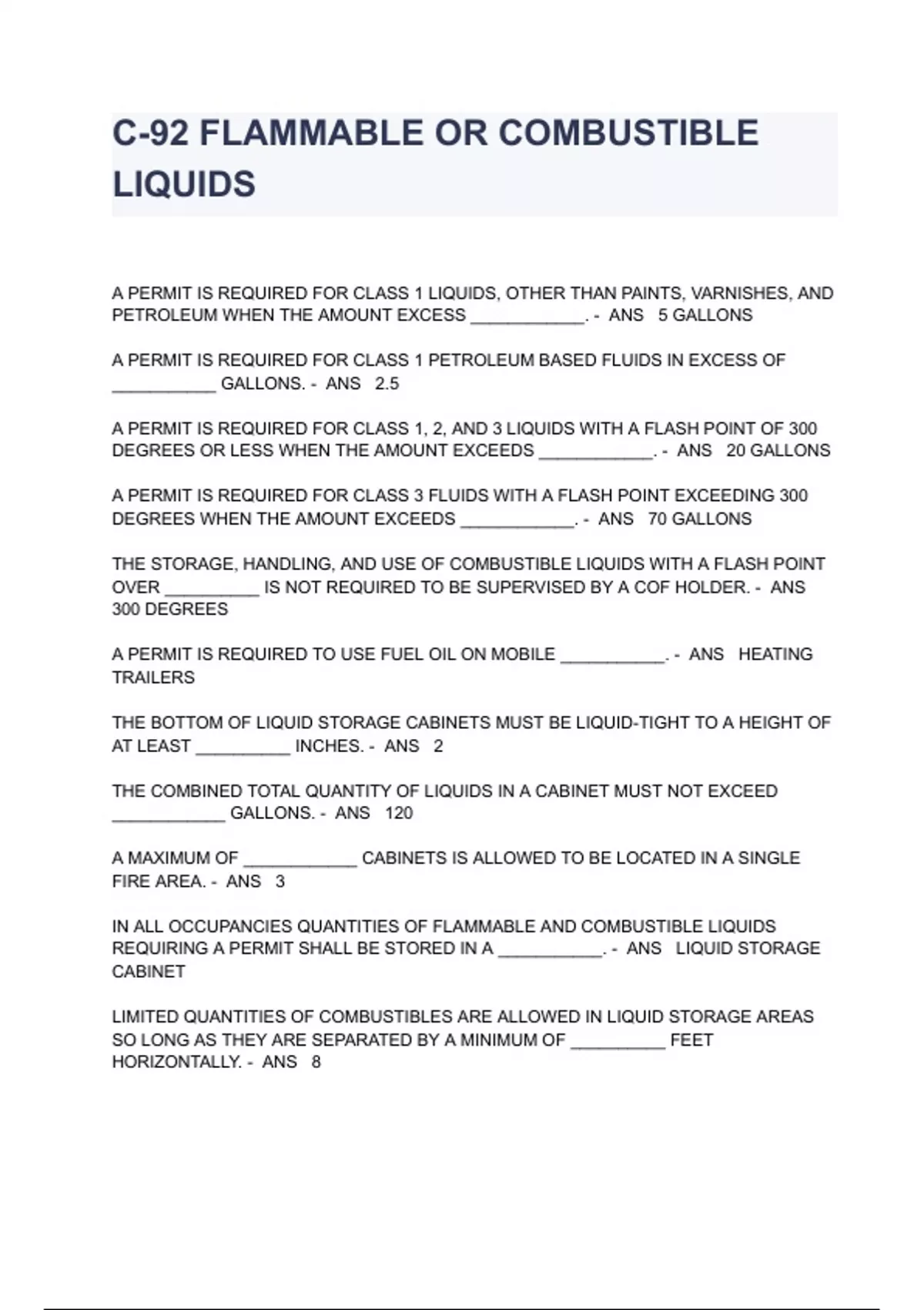 C-92 FLAMMABLE OR COMBUSTIBLE LIQUIDS A PERMIT IS REQUIRED FOR CLASS 1 LIQUIDS, OTHER THAN PAINTS, VARNISHES, AND PETROLEUM WHEN THE AMOUNT EXCESS ____________. - ANS 5 GALLONS A PERMIT IS REQUIRED FOR CLASS 1 PETROLEUM BASED FLUIDS IN EXCESS OF ___________ GALLONS. - ANS 2.5 A PERMIT IS REQUIRED FOR CLASS 1, 2, AND 3 LIQUIDS WITH A FLASH POINT OF 300 DEGREES OR LESS WHEN THE AMOUNT EXCEEDS ____________. - ANS 20 GALLONS A PERMIT IS REQUIRED FOR CLASS 3 FLUIDS WITH A FLASH POINT EXCEEDING 300 DEGREES WHEN THE AMOUNT EXCEEDS ____________. - ANS 70 GALLONS THE STORAGE, HANDLING, AND USE OF COMBUSTIBLE LIQUIDS WITH A FLASH POINT OVER __________ IS NOT REQUIRED TO BE SUPERVISED BY A COF HOLDER. - ANS 300 DEGREES A PERMIT IS REQUIRED TO USE FUEL OIL ON MOBILE ___________. - ANS HEATING TRAILERS THE BOTTOM OF LIQUID STORAGE CABINETS MUST BE LIQUID-TIGHT TO A HEIGHT OF AT LEAST __________ INCHES. - ANS 2 THE COMBINED TOTAL QUANTITY OF LIQUIDS IN A CABINET MUST NOT EXCEED ____________ GALLONS. - ANS 120 A MAXIMUM OF ____________ CABINETS IS ALLOWED TO BE LOCATED IN A SINGLE FIRE AREA. - ANS 3 IN ALL OCCUPANCIES QUANTITIES OF FLAMMABLE AND COMBUSTIBLE LIQUIDS REQUIRING A PERMIT SHALL BE STORED IN A ___________. - ANS LIQUID STORAGE CABINET LIMITED QUANTITIES OF COMBUSTIBLES ARE ALLOWED IN LIQUID STORAGE AREAS SO LONG AS THEY ARE SEPARATED BY A MINIMUM OF __________ FEET HORIZONTALLY. - ANS 8 PALLET STORAGE SHALL BE SEPARATED FROM LIQUID STORAGE BY AISLED THAT ARE AT LEAST __________ FEET - ANS 8 WHEN RACKS ARE USED, A MINIMUM __________ FOOT WIDE AISLE SHALL BE PROVIDED. - ANS 4 ISOLATE INCOMPATIBLE MATERIAL BY A NONCUMBUSTIBLE PARTITION NOT LESS THAN __________ INCHES ABOVE AND TO THE SIDES. - ANS 18 ABOVEGROUND AND UNDERGROUND TANKS SHALL NOT BE FILLED IN EXCESS OF ____________ PERCENT THEIR CAPACITY. - ANS 95 AN UNDERGROUND STORAGE TANK EXISTING PRIOR TO JUL 1ST 2008 SHALL BE PRECISION TESTED AT LEAST ONCE EVERY ___________ YEARS. - ANS 5 OUT OF SERVICE STORAGE SYSTEMS ARE THOSE THAT ARE NOT IN USE FOR __________ DAYS OR MORE. - ANS 30 EXCEPTIONS TO OUT OF SERVICE SYSTEM REQUIREMENTS ARE THOSE THAT ARE USED ___________ OR ____________. - ANS SEASONALLY, STANDBY TEMPORARILY OUT OF SERVICE SYSTEMS ARE THOSE THAT HAVE NOT BEEN USED FOR OVER 30 DAYS BUT LESS THAN __________ YEAR. - ANS ONE ALL UNDERGROUND TANK PIPING, INCLUDING ____________ SYSTEM LINES SHALL BE DISCONNECTED, CAPPED, PLUGGED AND OPENINGS FILLED WITH CONCRETE. - ANS FIRE EXTINGUISHING EXCEPT WHERE IMPRACTICAL, ABOVEGROUND TANK __________ SHALL BE REMOVED FROM THE PREMISES. - ANS PIPING COMPRESSED GASSES SHALL NOT BE USED