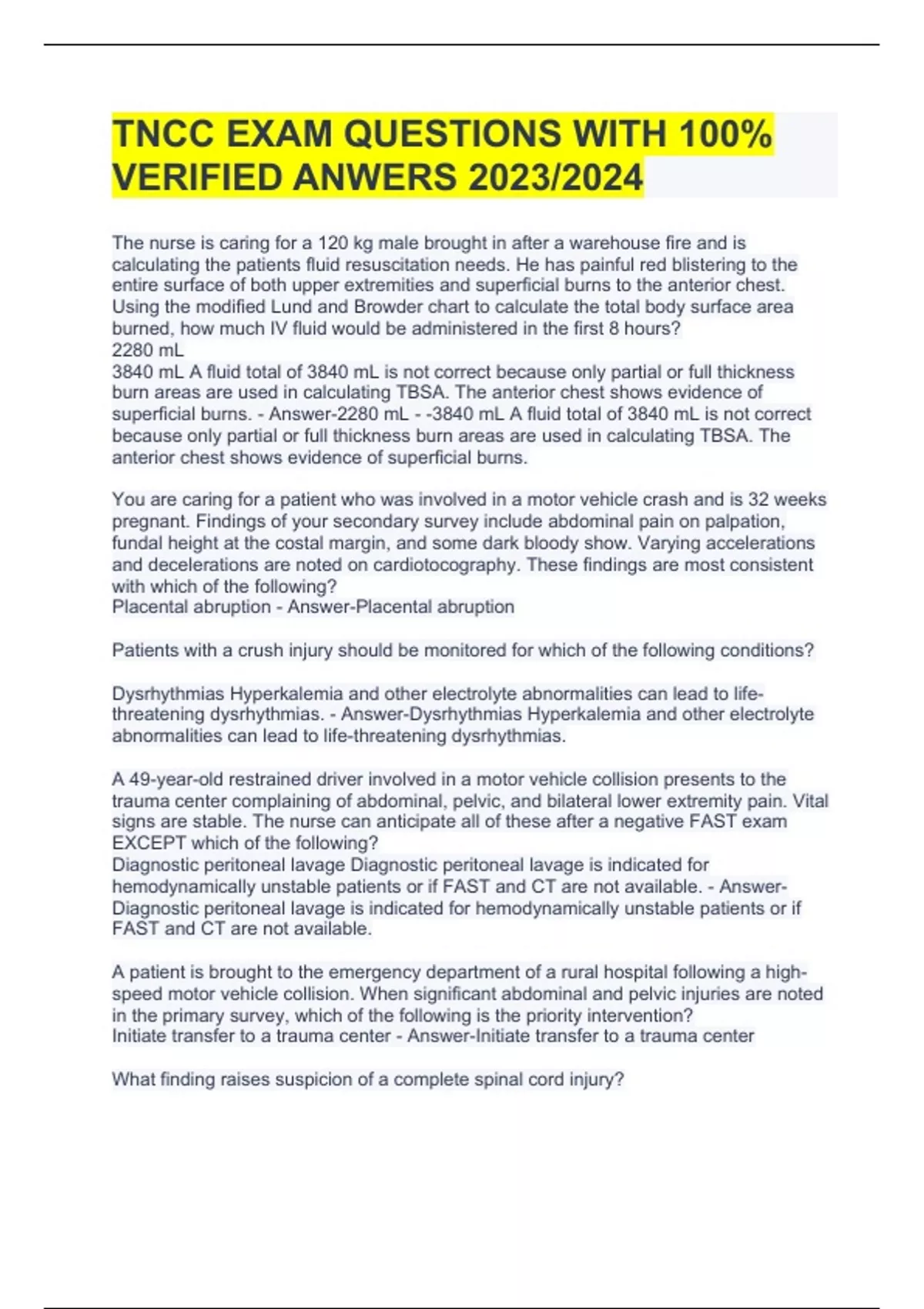 TNCC EXAM QUESTIONS WITH 100% VERIFIED ANWERS 2023/2024