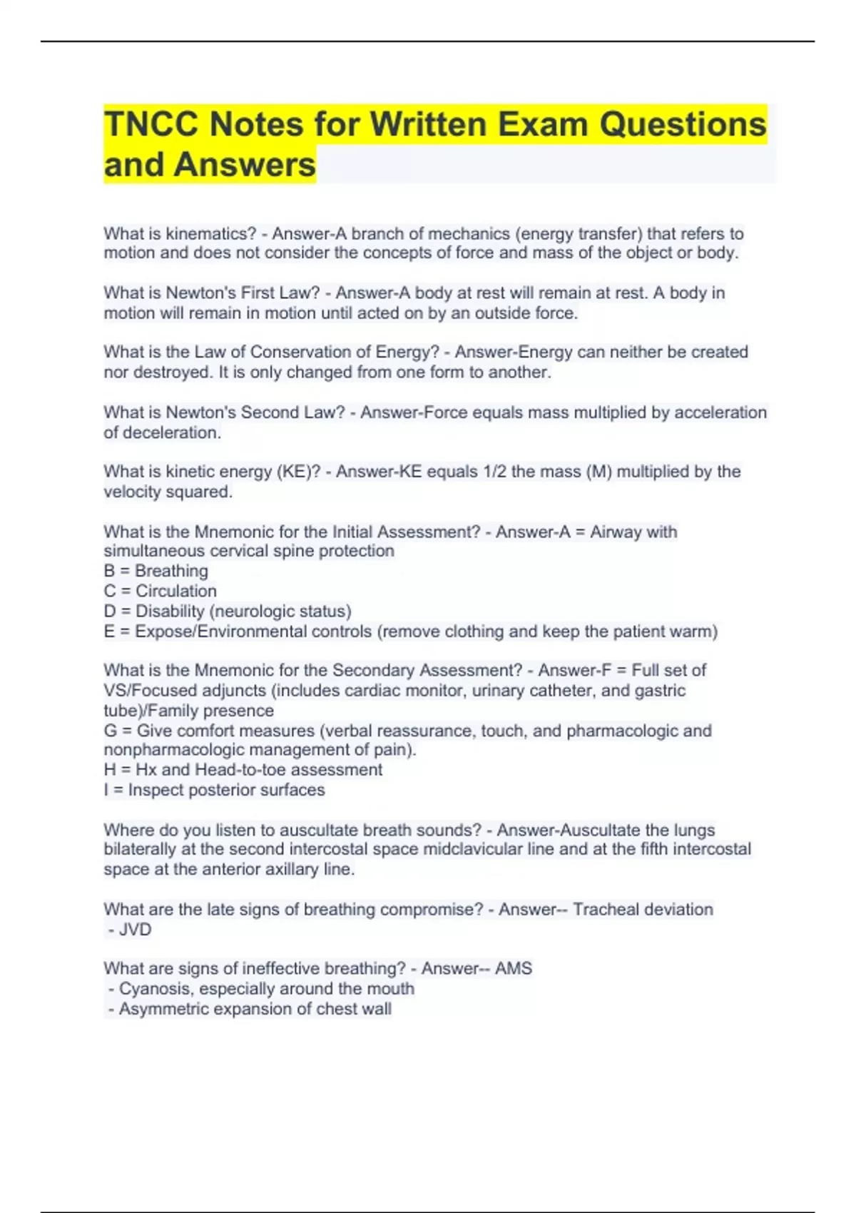 TNCC Notes for Written Exam Questions and Answers