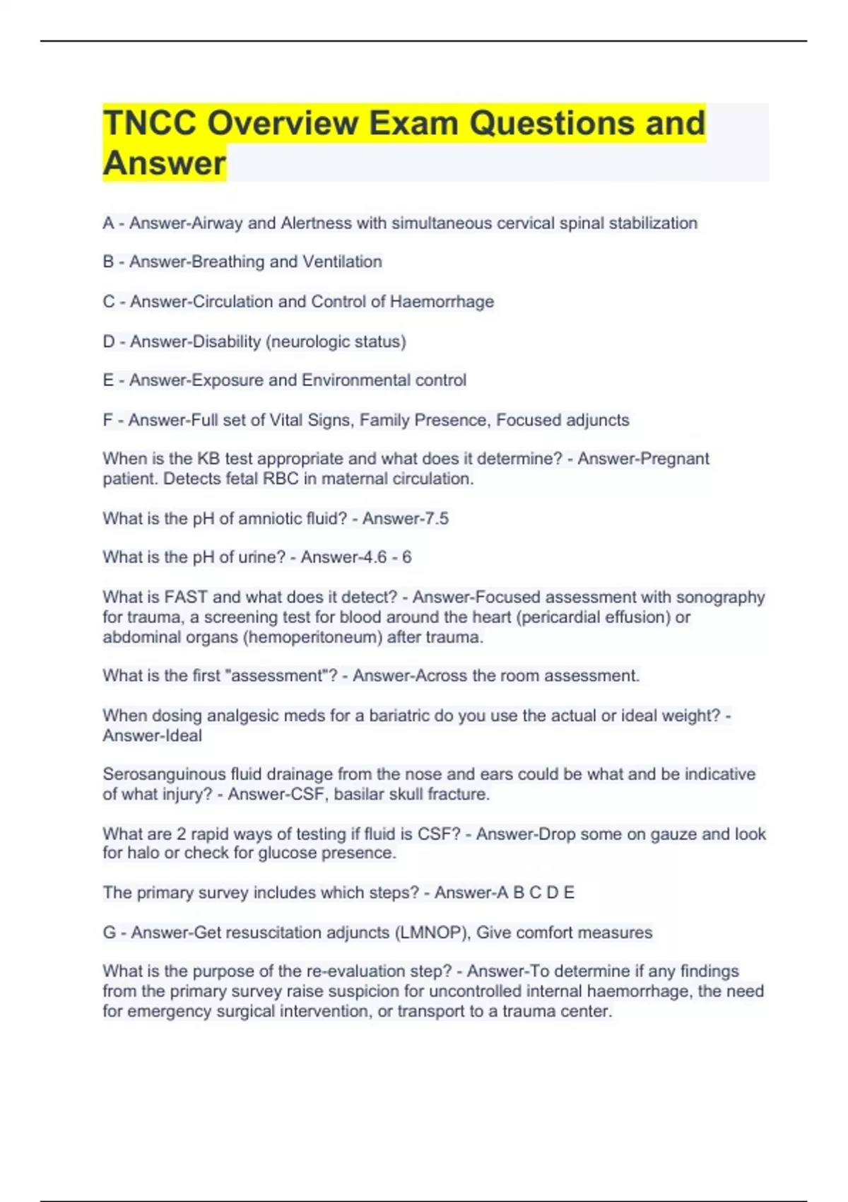 TNCC Overview Exam Questions and