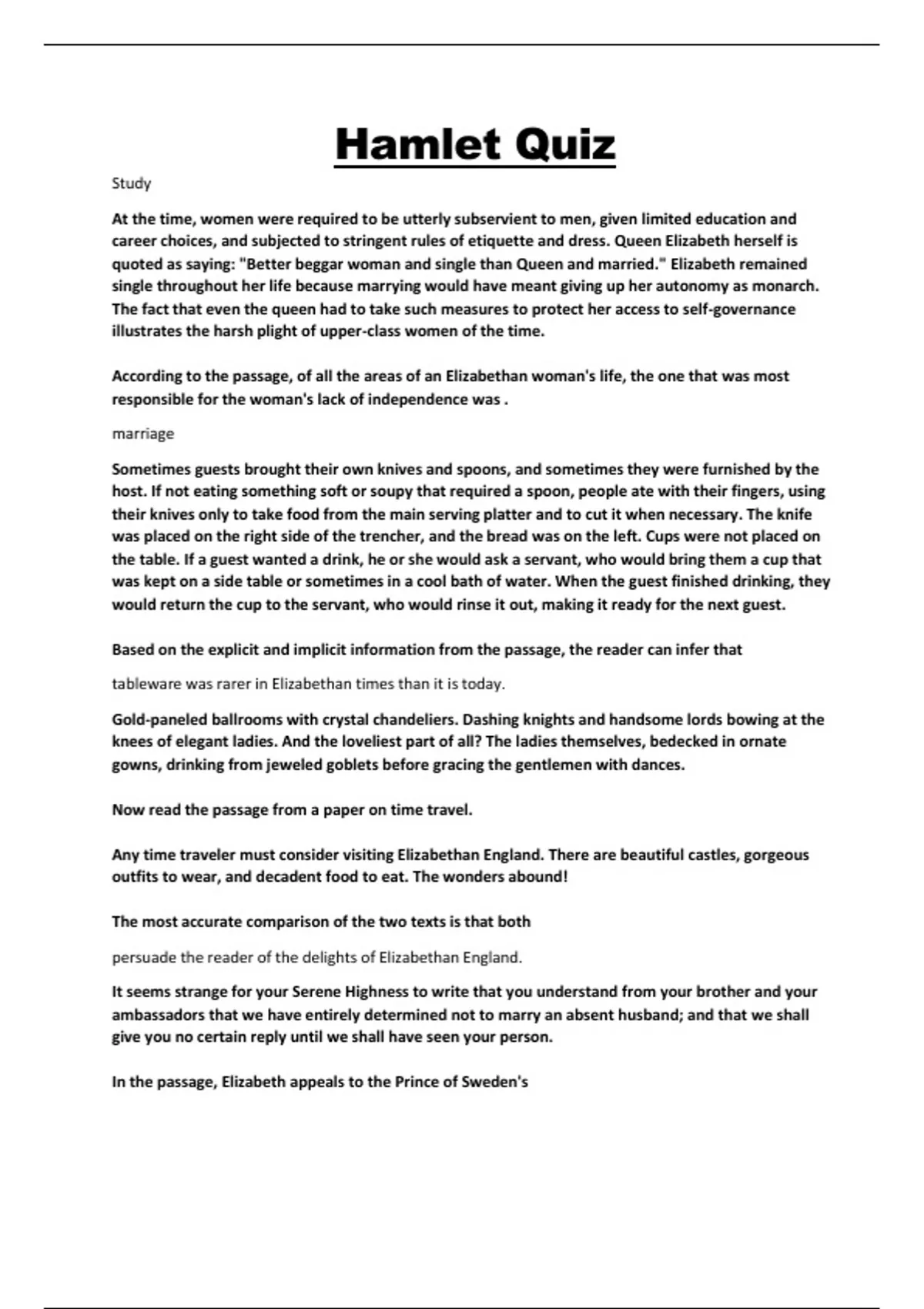 At the time, women were required to be utterly subservient to men, given limited education and career choices, and subjected to stringent rules of etiquette and dress. Queen Elizabeth herself is quoted as saying: "Better beggar woman and single than Queen and married." Elizabeth remained single throughout her life because marrying would have meant giving up her autonomy as monarch. The fact that even the queen had to take such measures to protect her access to self-governance illustrates the harsh plight of upper-class women of the time. According to the passage, of all the areas of an Elizabethan woman's life, the one that was most responsible for the woman's lack of independence was . marriage Sometimes guests brought their own knives and spoons, and sometimes they were furnished by the host. If not eating something soft or soupy that required a spoon, people ate with their fingers, using their knives only to take food from the main serving platter and to cut it when necessary. The knife was placed on the right side of the trencher, and the bread was on the left. Cups were not placed on the table. If a guest wanted a drink, he or she would ask a servant, who would bring them a cup that was kept on a side table or sometimes in a cool bath of water. When the guest finished drinking, they would return the cup to the servant, who would rinse it out, making it ready for the next guest. Based on the explicit and implicit information from the passage, the reader can infer that tableware was rarer in Elizabethan times than it is today. Gold-paneled ballrooms with crystal chandeliers. Dashing knights and handsome lords bowing at the knees of elegant ladies. And the loveliest part of all? The ladies themselves, bedecked in ornate gowns, drinking from jeweled goblets before gracing the gentlemen with dances. Now read the passage from a paper on time travel. Any time traveler must consider visiting Elizabethan England. There are beautiful castles, gorgeous outfits to wear, and decadent food to eat. The wonders abound! The most accurate comparison of the two texts is that both persuade the reader of the delights of Elizabethan England. It seems strange for your Serene Highness to write that you understand from your brother and your