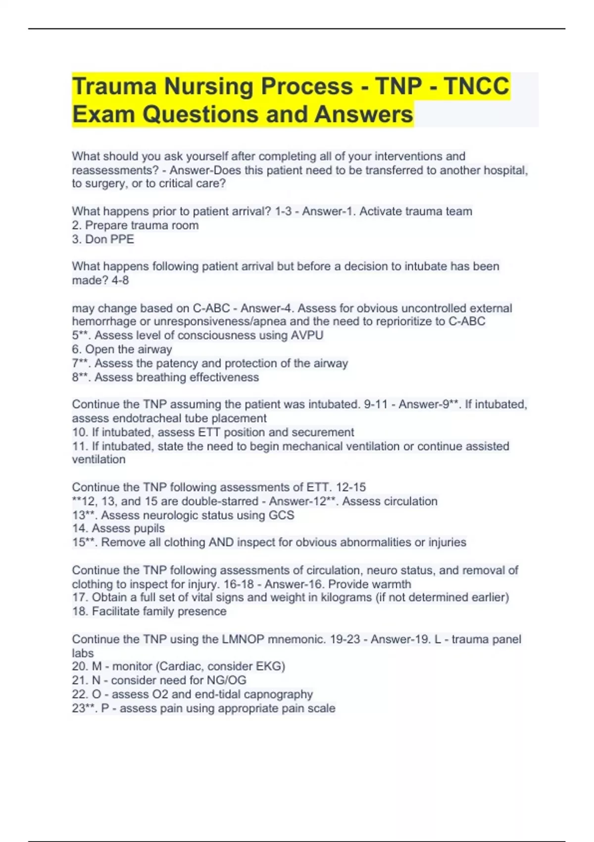 Continue the TNP using the LMNOP mnemonic. 19-23 - Answer-19. L - trauma panel