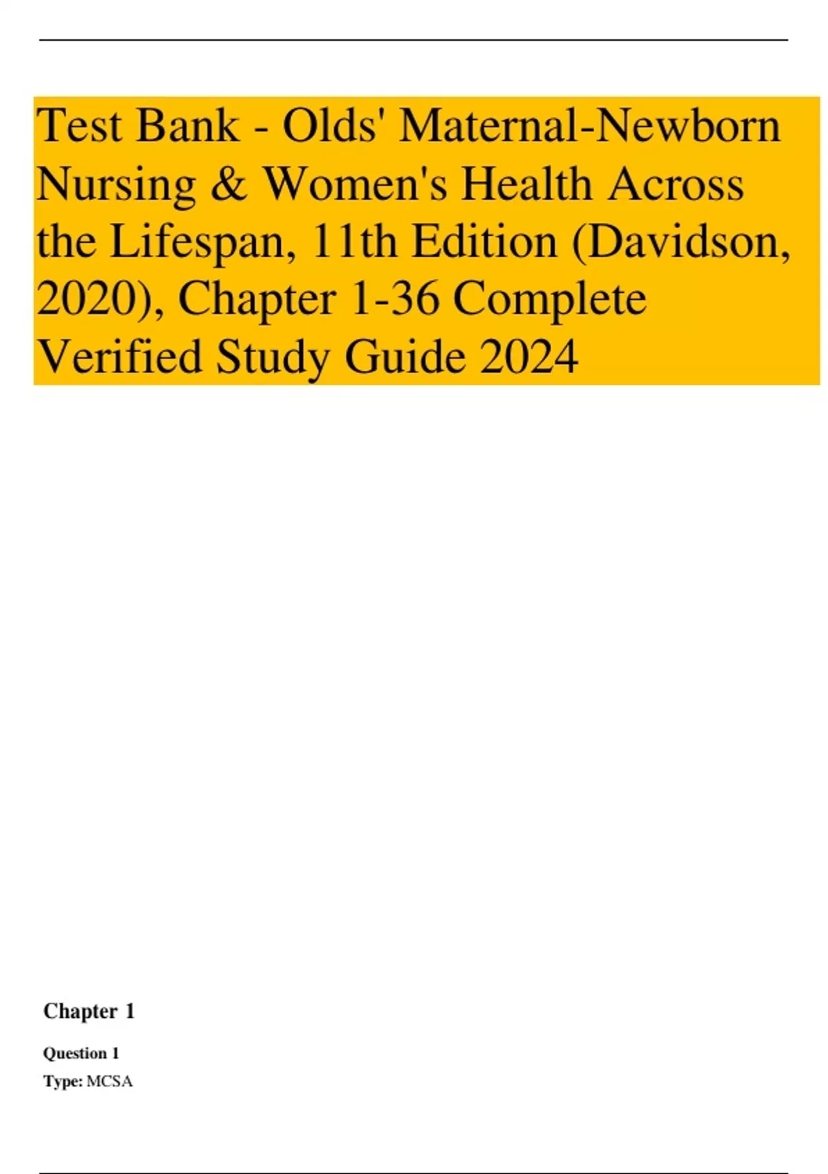 Test Bank - Olds' Maternal-Newborn Nursing & Women's Health Across the Lifespan, 11th Edition (Davidson, 2020), Chapter 1-36 Complete Verified Study Guide 2024