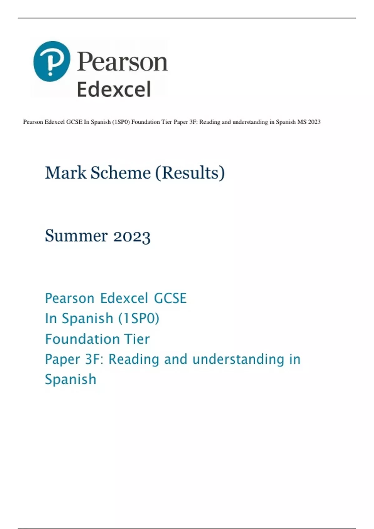 Pearson Edexcel GCSE In Spanish (1SP0) Foundation Tier Paper 3F: Reading and understanding in Spanish MS 2023