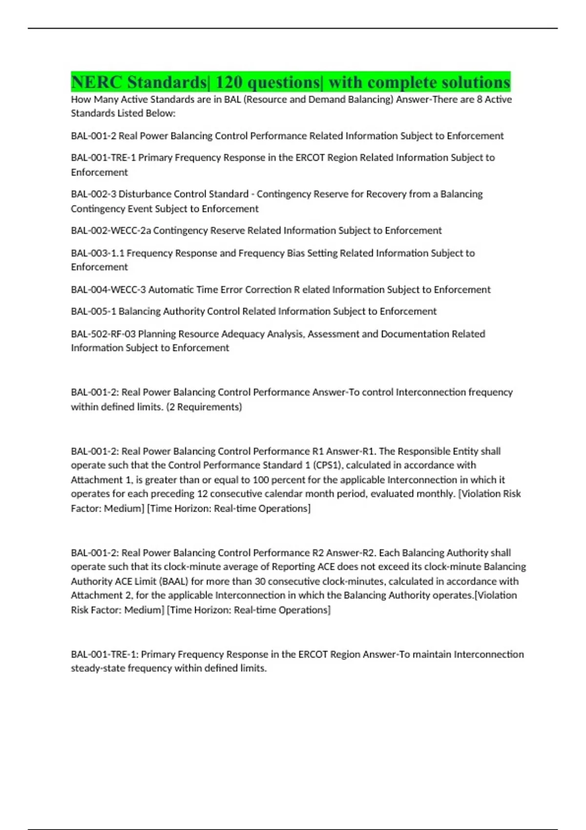 NERC Standards| 120 questions| with complete solutions How Many Active Standards are in BAL (Resource and Demand Balancing) Answer-There are 8 Active Standards Listed Below: BAL-001-2 Real Power Balancing Control Performance Related Information Subject to Enforcement BAL-001-TRE-1 Primary Frequency Response in the ERCOT Region Related Information Subject to Enforcement BAL-002-3 Disturbance Control Standard - Contingency Reserve for Recovery from a Balancing Contingency Event Subject to Enforcement BAL-002-WECC-2a Contingency Reserve Related Information Subject to Enforcement BAL-003-1.1 Frequency Response and Frequency Bias Setting Related Information Subject to Enforcement BAL-004-WECC-3 Automatic Time Error Correction R elated Information Subject to Enforcement BAL-005-1 Balancing Authority Control Related Information Subject to Enforcement BAL-502-RF-03 Planning Resource Adequacy Analysis, Assessment and Documentation Related Information Subject to Enforcement BAL-001-2: Real Power Balancing Control Performance Answer-To control Interconnection frequency within defined limits. (2 Requirements) BAL-001-2: Real Power Balancing Control Performance R1 Answer-R1. The Responsible Entity shall operate such that the Control Performance Standard 1 (CPS1), calculated in accordance with Attachment 1, is greater than or equal to 100 percent for the applicable Interconnection in which it operates for each preceding 12 consecutive calendar month period, evaluated monthly. [Violation Risk Factor: Medium] [Time Horizon: Real-time Operations] BAL-001-2: Real Power Balancing Control Performance R2 Answer-R2. Each Balancing Authority shall operate such that its clock-minute average of Reporting ACE does not exceed its clock-minute Balancing Authority ACE Limit (BAAL) for more than 30 consecutive clock-minutes, calculated in accordance with Attachment 2, for the applicable Interconnection in which the Balancing Authority operates.[Violation Risk Factor: Medium] [Time Horizon: Real-time Operations] BAL-001-TRE-1: Primary Frequency Response in the ERCOT Region Answer-To maintain Interconnection steady-state frequency within defined limits. C
