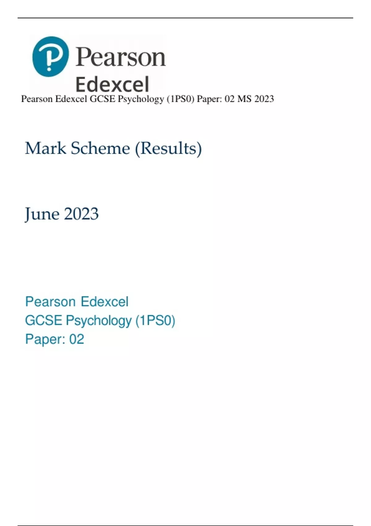 Pearson Edexcel GCSE Psychology (1PS0) Paper: 02 MS 2023