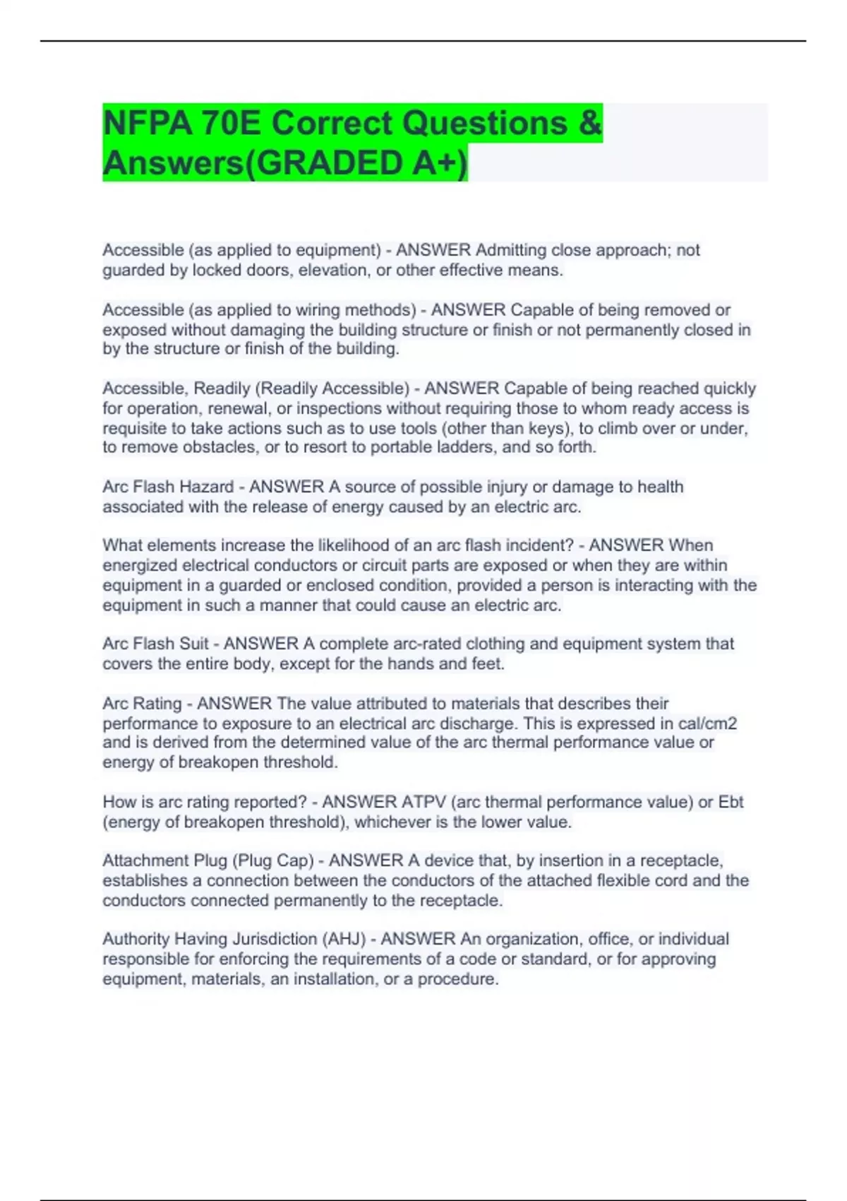 Accessible (as applied to equipment) - ANSWER Admitting close approach; not guarded by locked doors, elevation, or other effective means. Accessible (as applied to wiring methods) - ANSWER Capable of being removed or exposed without damaging the building structure or finish or not permanently closed in by the structure or finish of the building. Accessible, Readily (Readily Accessible) - ANSWER Capable of being reached quickly for operation, renewal, or inspections without requiring those to whom ready access is requisite to take actions such as to use tools (other than keys), to climb over or under, to remove obstacles, or to resort to portable ladders, and so forth. Arc Flash Hazard - ANSWER A source of possible injury or damage to health associated with the release of energy caused by an electric arc. What elements increase the likelihood of an arc flash incident? - ANSWER When energized electrical conductors or circuit parts are exposed or when they are within equipment in a guarded or enclosed condition, provided a person is interacting with the equipment in such a manner that could cause an electric arc. Arc Flash Suit - ANSWER A complete arc-rated clothing and equipment system that covers the entire body, except for the hands and feet. Arc Rating - ANSWER The value attributed to materials that describes their performance to exposure to an electrical arc discharge. This is expressed in cal/cm2 and is derived from the determined value of the arc thermal performance value or energy of breakopen threshold. How is arc rating reported? - ANSWER ATPV (arc thermal performance value) or Ebt (energy of breakopen threshold), whichever is the lower value. Attachment Plug (Plug Cap) - ANSWER A device that, by insertion in a receptacle, establishes a connection between the conductors of the attached flexible cord and the conductors connected permanently to the receptacle. Authority Having Jurisdiction (AHJ) - ANSWER An organization, office, or individual responsible for enforcing the requirements of a code or standard, or for approving equipment, materials, an installation, or a procedure. Automatic - ANSWER Performing a function without the necessity of human intervention. Balaclava (Sock Hood). - ANSWER An arc-rated hood that protects the neck and head except for the facial area of the eyes and nose. Barricade - ANSWER A physical obstruction such as tapes, cones, or A-frame-type wood or metal structures intended to provide a warning and