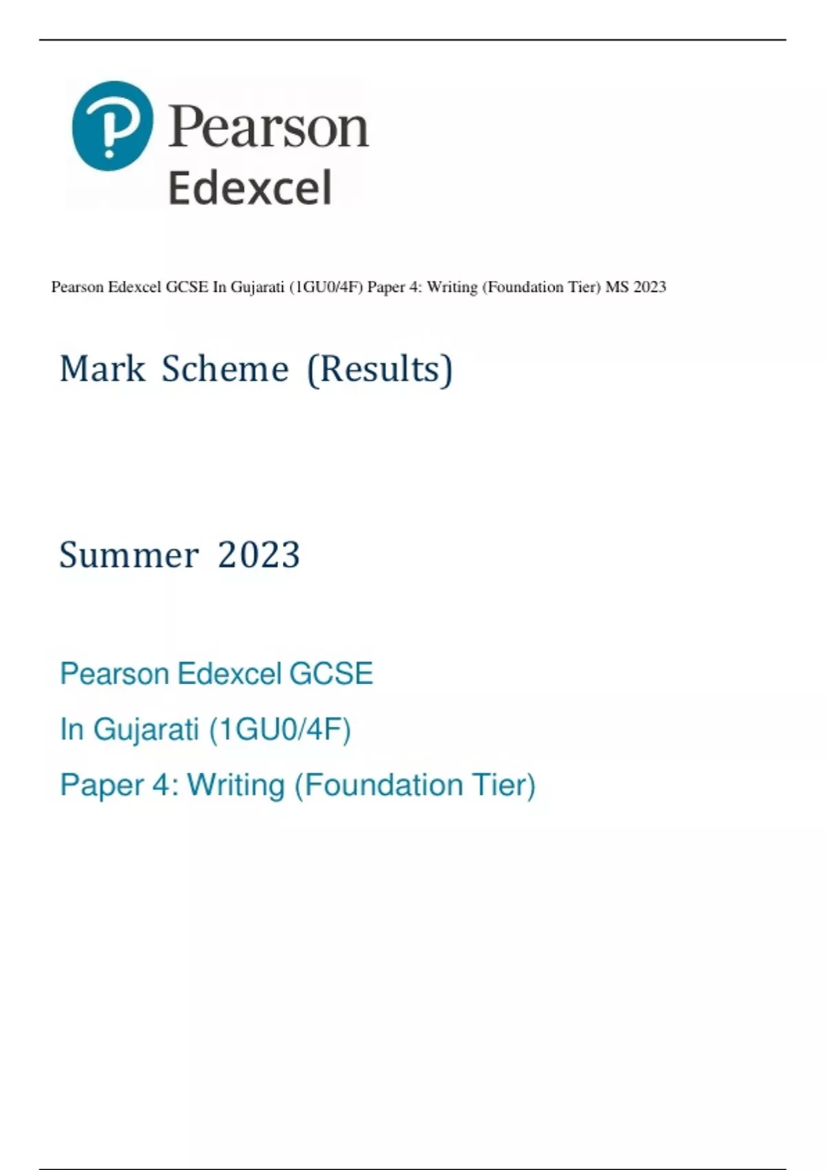 Pearson Edexcel GCSE In Gujarati (1GU0/4F) Paper 4: Writing (Foundation Tier) MS 2023