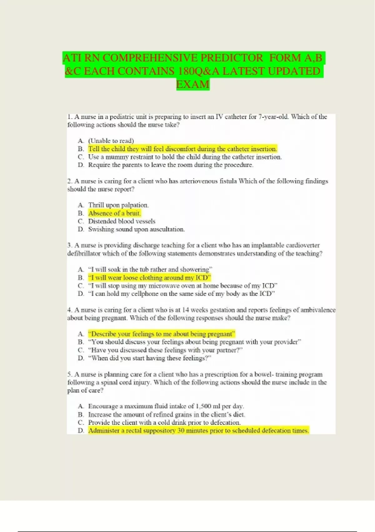 ATI RN COMPREHENSIVE PREDICTOR FORM A,B &C EACH CONTAINS 180Q&A LATEST UPDATED EXAM lOM oA R c P S D| S - The Marketplace to Buy and Sell your Study Material 6. A nurse is caring for a client who is in active labor and requests pain management. Which of the following actions should the nurse take? A. Administer ondansetron. B. Place the client in a warm shower. C. Apply fundal pressure during contractions. D. Assist the client to a supine position. 7. a nurse in an emergency department is performing triage for multiple clients following a disaster in the community. To which of the following types of injuries should the nurse assign the highest priority? A. Below-the knee amputation B. Fractured tibia C. 95% full-thickness body burn D. 10cm (4in) laceration to the forearm 8. a nurse manager is updating protocols for the use of belt restraints. Which of the following guidelines should the nurse include? A. Remove the client’s restraint every 4hr B. Document the client’s condition every 15 min C. Attach the restrain to the bed’s side rails D. Request a PRN restrain prescription for clients who are aggressive 9. A nurse is teaching an in-service about nursing leadership. Which of the following information should the nurse include about an effective leader? A. Acts as an advocate for the nursing unit. B. (Unable to read) for the unit C. Priorities staff request over client needs. D. Provides routine client care and documentation. 10. A nurse is reviewing the laboratory findings of a client who has diabetes mellitus and reports that she has been following her (unable to read) care. The nurse should identify which of the following findings indicates a need to revise the client’s plan of care. A. Serum sodium 144 mEq/ B. (Unable to read) C. Hba1c 10 % D. Random serum glucose 190 mg/dl.