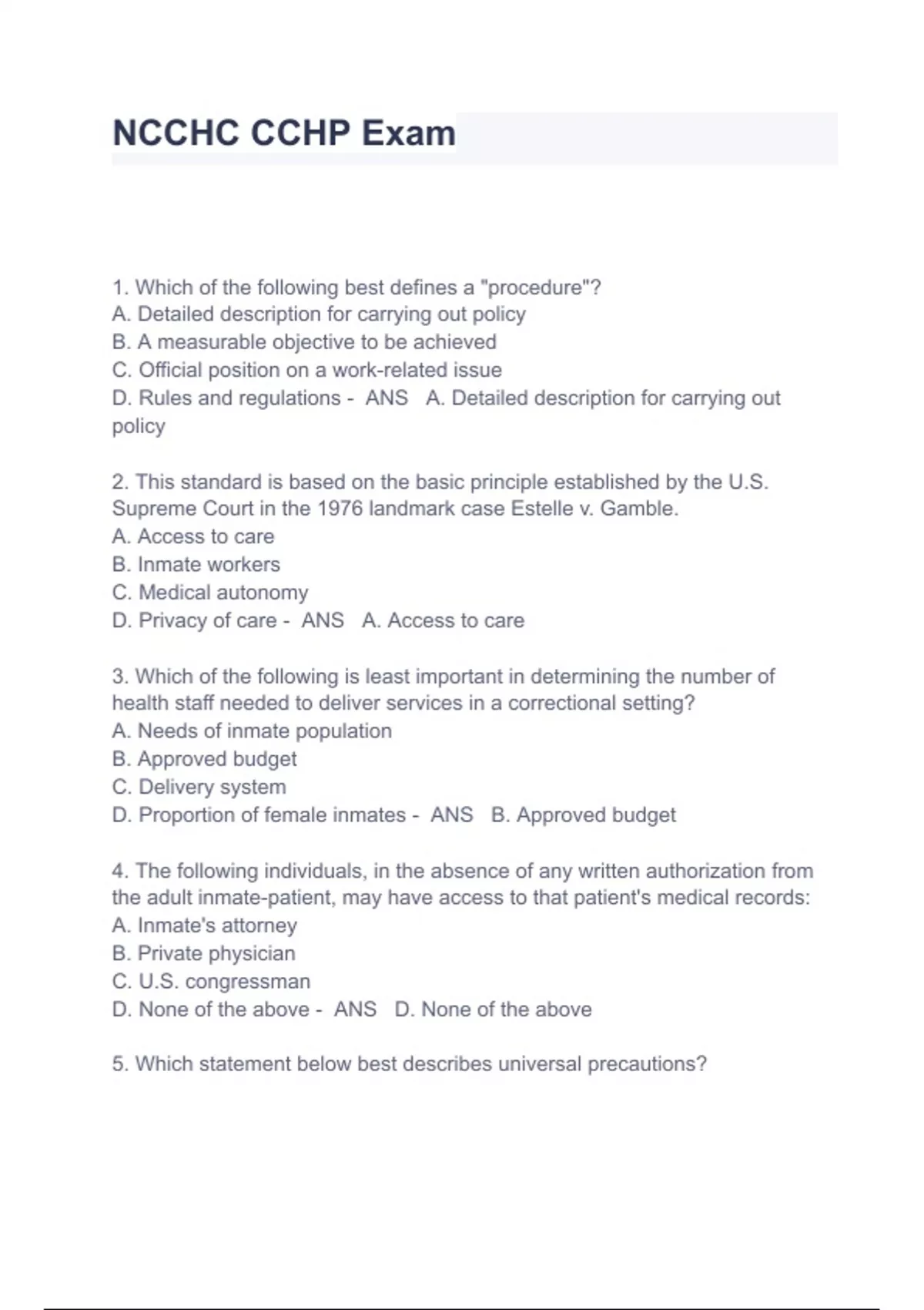 NCCHC CCHP Exam Questions With Correct Solutions 1. Which of the following best defines a "procedure"? A. Detailed description for carrying out policy B. A measurable objective to be achieved C. Official position on a work-related issue D. Rules and regulations - ANS A. Detailed description for carrying out policy 2. This standard is based on the basic principle established by the U.S. Supreme Court in the 1976 landmark case Estelle v. Gamble. A. Access to care B. Inmate workers C. Medical autonomy D. Privacy of care - ANS A. Access to care 3. Which of the following is least important in determining the number of health staff needed to deliver services in a correctional setting? A. Needs of inmate population B. Approved budget C. Delivery system D. Proportion of female inmates - ANS B. Approved budget 4. The following individuals, in the absence of any written authorization from the adult inmate-patient, may have access to that patient's medical records: A. Inmate's attorney B. Private physician C. U.S. congressman D. None of the above - ANS D. None of the above 5. Which statement below best describes universal precautions? A. Adhering to advisories published by the Centers for Disease Control and Prevention for disposing of infectious waste B. Taking protective steps with patients known to have infectious diseases so as to minimize exposure of workers and others to contagious disease C. Assuming all patients present a potential for transmission of infectious disease and adopting the same protective techniques with every patient D. Using masks, gowns and gloves for protection from infectious disease - ANS C. Assuming all patients present a potential for transmission of infectious disease and adopting the same protective techniques with every patient What is the Access to Care standard? - ANS Inmates have access to care for their serious medical, dental, and mental health needs. Define "access to care" (three criteria) - ANS 1. In a timely manner, a patient is seen by a qualified health care professional, 2. is rendered a clinical judgment, 3. and receives care that is ordered What is the basic principle established by the U.S. Supreme Court landmark case in 1976 Estelle v. Gamble? - ANS Inmates must have access to care to meet their serious health needs. What is the fundamental principle on which all National Commission on Correctional Health Care standards based? - ANS Inmates must have access to care to meet their serious health needs. List five examples of unreasonable barriers to inmates' access to health services. - ANS 1. punishing inmates for seeking care for their health needs 2. assessing excessive fees that prevent or deter inmates from seeking care 3. deterring inmates from seeking care, such as holding sick call at 2AM 4. having understaffed, underfunded, poorly organized system resulting in inability to provide appropriate and timely access to care 5. having a utilization review process that delays or denies necessary care