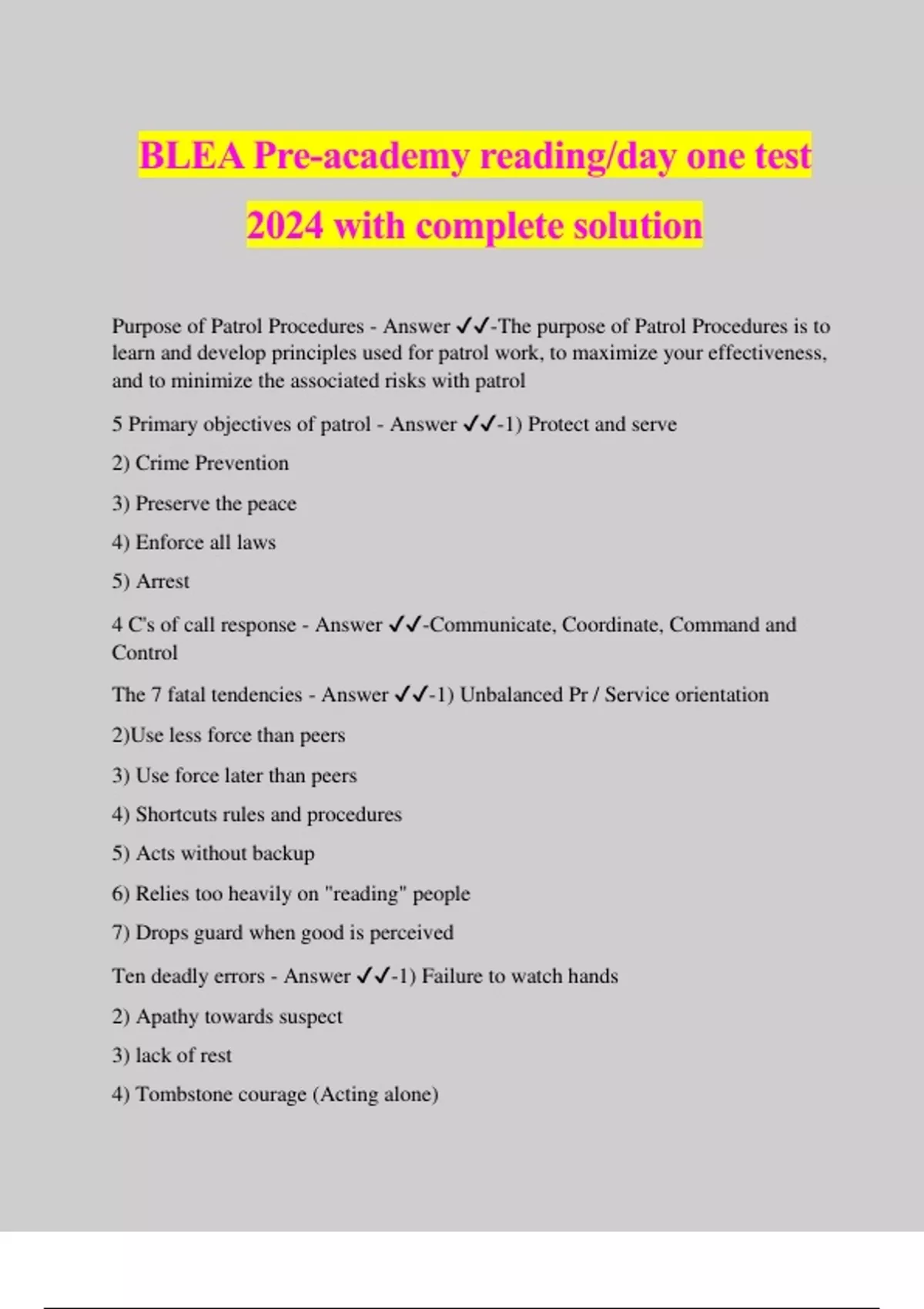 BLEA Pre-academy reading/day one test 2024 with complete solution Purpose of Patrol Procedures - Answer ️️ -The purpose of Patrol Procedures is to learn and develop principles used for patrol work, to maximize your effectiveness, and to minimize the associated risks with patrol 5 Primary objectives of patrol - Answer ️️ -1) Protect and serve 2) Crime Prevention 3) Preserve the peace 4) Enforce all laws 5) Arrest 4 C's of call response - Answer ️️ -Communicate, Coordinate, Command and Control The 7 fatal tendencies - Answer ️️ -1) Unbalanced Pr / Service orientation 2)Use less force than peers 3) Use force later than peers 4) Shortcuts rules and procedures 5) Acts without backup 6) Relies too heavily on "reading" people 7) Drops guard when good is perceived Ten deadly errors - Answer ️️ -1) Failure to watch hands 2) Apathy towards suspect 3) lack of rest 4) Tombstone courage (Acting alone) 5) Preoccupation 6) Missing danger signs 7) Taking a bad position 8) Relaxing too soon 9) Improper search or handcuffing 10) Failure to maintain proficiency with equipment What is Criminal Procedure? - Answer ️️ -Criminal Procedure is the way in which peace officers lawfully do their job to ensure successful prosecution of offenders. Substantive Law - Answer ️️ -Legislated acts Establishes the acts and mental state necessary to commit a crime Procedural Law - Answer ️️ -Legislated acts Establishes the procedures to be employed in governmental affairs Significance of Criminal procedures - Answer ️️ -Protects the rights of all citizens Enhances the ability to successfully prosecute criminals reduces criminal liability to the officer reduces civil liability to the officer reduces the likelihood of internal discipline Enhances public cooperation in those "Critical times" Sources of criminal procedure - Answer ️️ -Constitutional documents RCW Washington state court rules court ruling from federal and state courts agency policies common law Law enforcement Liability and sanctions - Answer ️️ -No Absolute immunity for officers, only good faith immunity, another officer would have acted the same way in the same situation. Officers can be sued at any time Disciplinary sanctions applicable to officers - Answer ️️ -Criminal liability (being charged with a crime) Civil Liability (Sued) Department Liability (Discipline,