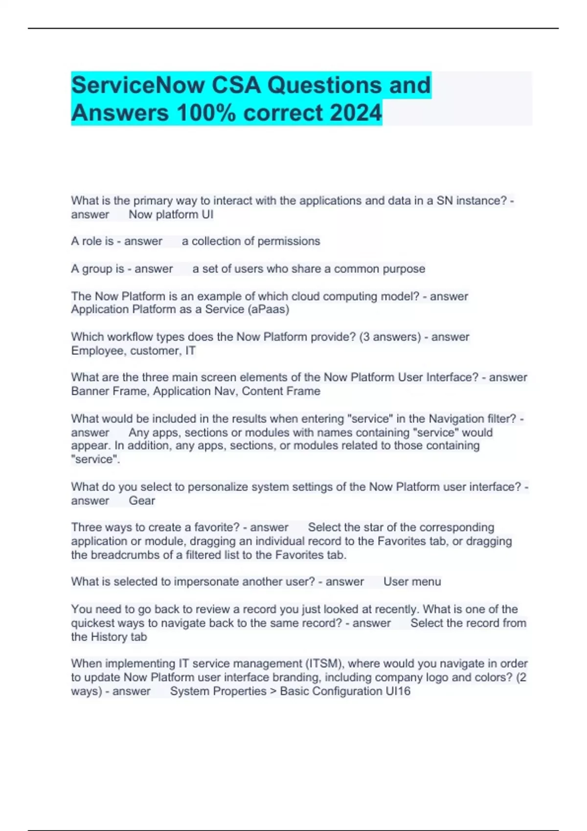 ServiceNow CSA Questions and Answers 100% correct 2024 What is the primary way to interact with the applications and data in a SN instance? Now platform UI A role is a collection of permissions A group is a set of users who share a common purpose The Now Platform is an example of which cloud computing model? Application Platform as a Service (aPaas) Which workflow types does the Now Platform provide? (3 answers) Employee, customer, IT What are the three main screen elements of the Now Platform User Interface? Banner Frame, Application Nav, Content Frame What would be included in the results when entering "service" in the Navigation filter? Any apps, sections or modules with names containing "service" would appear. In addition, any apps, sections, or modules related to those containing "service". What do you select to personalize system settings of the Now Platform user interface? Gear Three ways to create a favorite? Select the star of the corresponding application or module, dragging an individual record to the Favorites tab, or dragging the breadcrumbs of a filtered list to the Favorites tab. What is selected to impersonate another user? User menu You need to go back to review a record you just looked at recently. What is one of the quickest ways to navigate back to the same record? Select the record from the History tab When implementing IT service management (ITSM), where would you navigate in order to update Now Platform user interface branding, including company logo and colors? (2 ways) System Properties > Basic Configuration UI16 Guided Setup > ITSM Guided Setup What branding features can be configured? (4 features) System date/time formatting, Banner image (text and colors), Browser tab title, Navigator background and text colors Three benefits often recognized by branding your instance? Gain user trust, accelerate adoption rates, create shared identity What are the names of the three different levels of list context menus? List title menu, list fields context menu, and list column context menu What are list filter conditions also referred to as? Breadcrumbs Which menu can users access to display actions that involve creating quick reports, configuring lists, and exporting data? Column context menu Which search feature can be used to help narrow down search results in ServiceNow? Wildcard Characters A column in a list represents what in a SN instance? A field Which menu provides options related to viewing, configuring, creating favorites, and saving form data? Form context menu What allows users to see a time stamped history of all actions taken within a record? Activity Stream Which field type displays information from another table? Reference When using Form Designer, icons presented on each field include which of the following? (3 icons) Handle icon, edit icon, reference icon A field can be added to a table and form by accessing which part of the Form Designer interface? Field navigator Different form templates can be applied to a form by accessing the Template bar Best practices when configuring Assignment Rules or Predictive Intelligence? (4 practices) Set an assignment group and user based on the short description and on category and sub category. Ways to collaborate with team members on Tasks? (4 ways) Comments, Connect chat, User presence, Activity stream