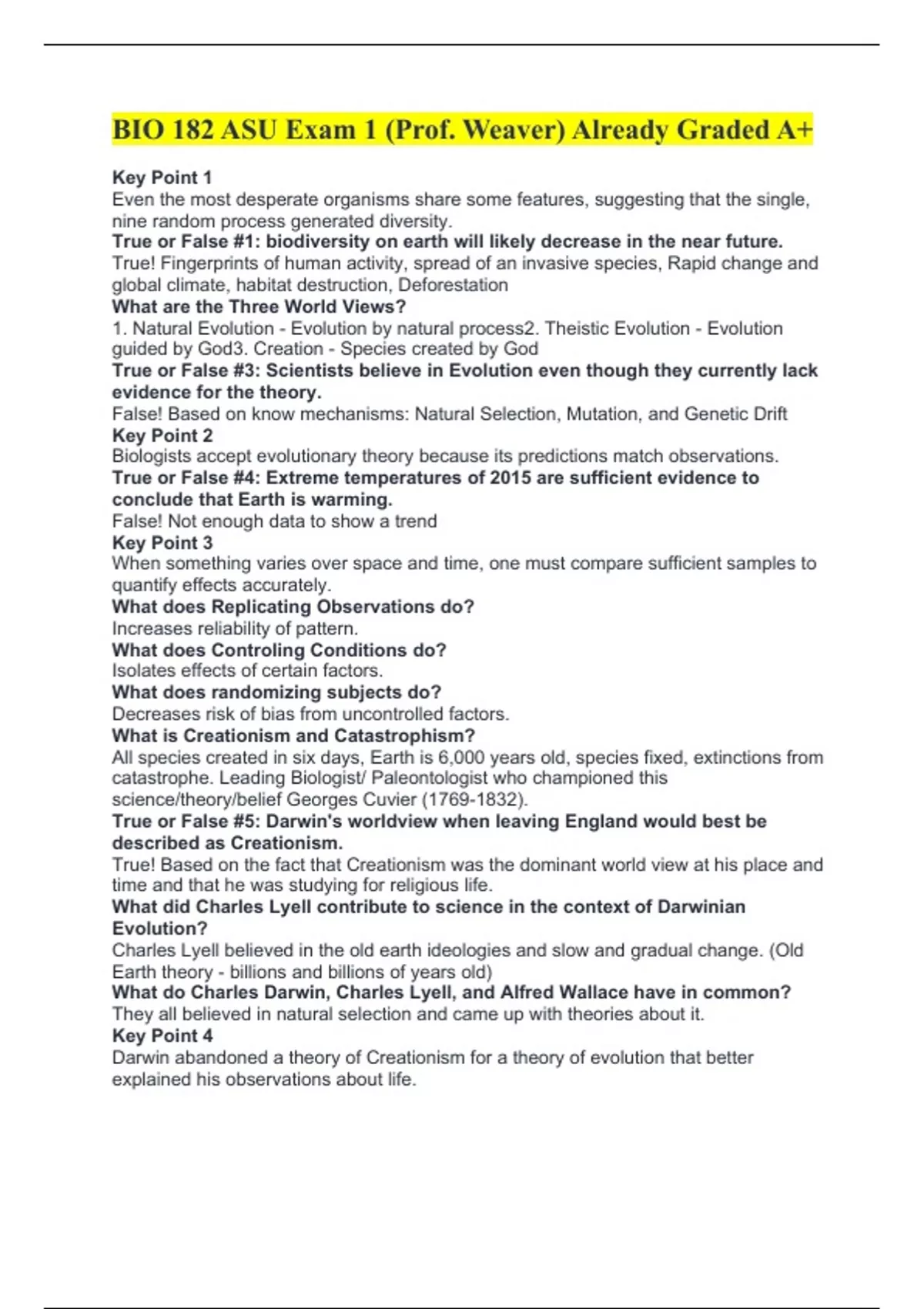 BIO 182 ASU Exam 1 (Prof. Weaver) Already Graded A+