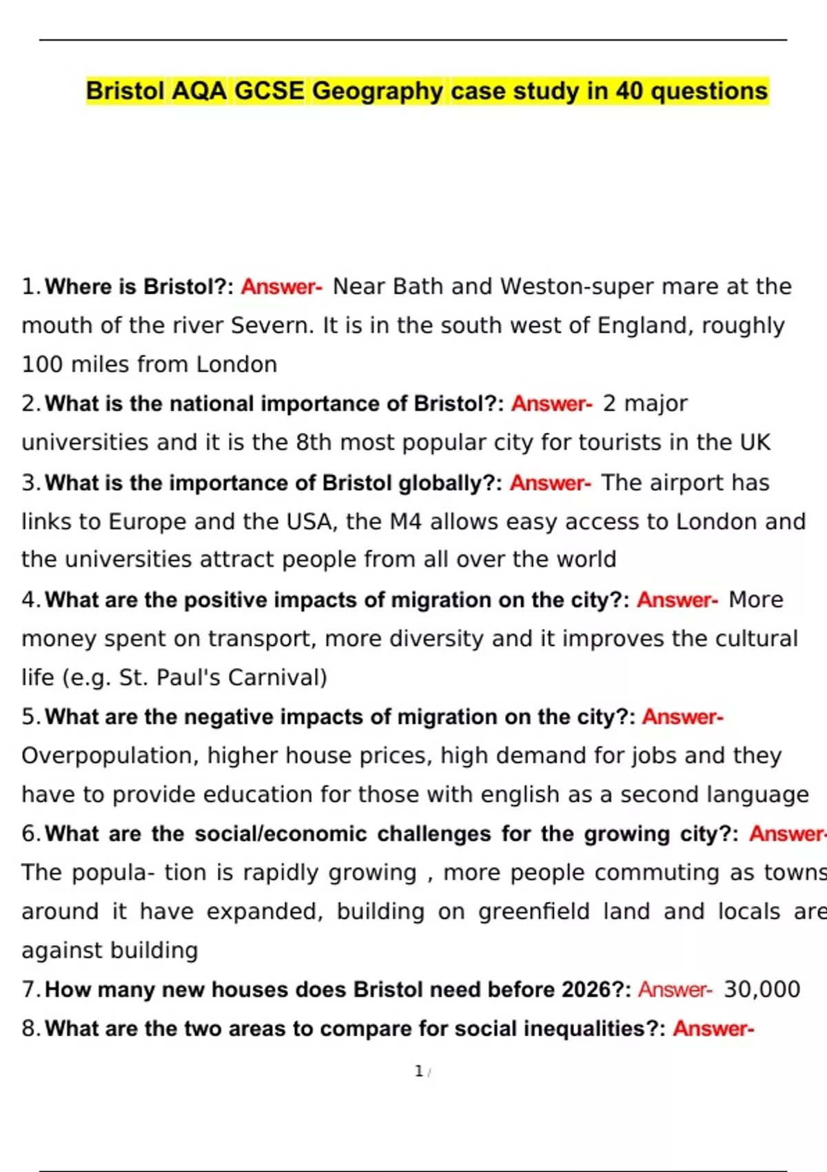 Bristol AQA GCSE Geography case study in 40 questions and answers 2024 with complete solution