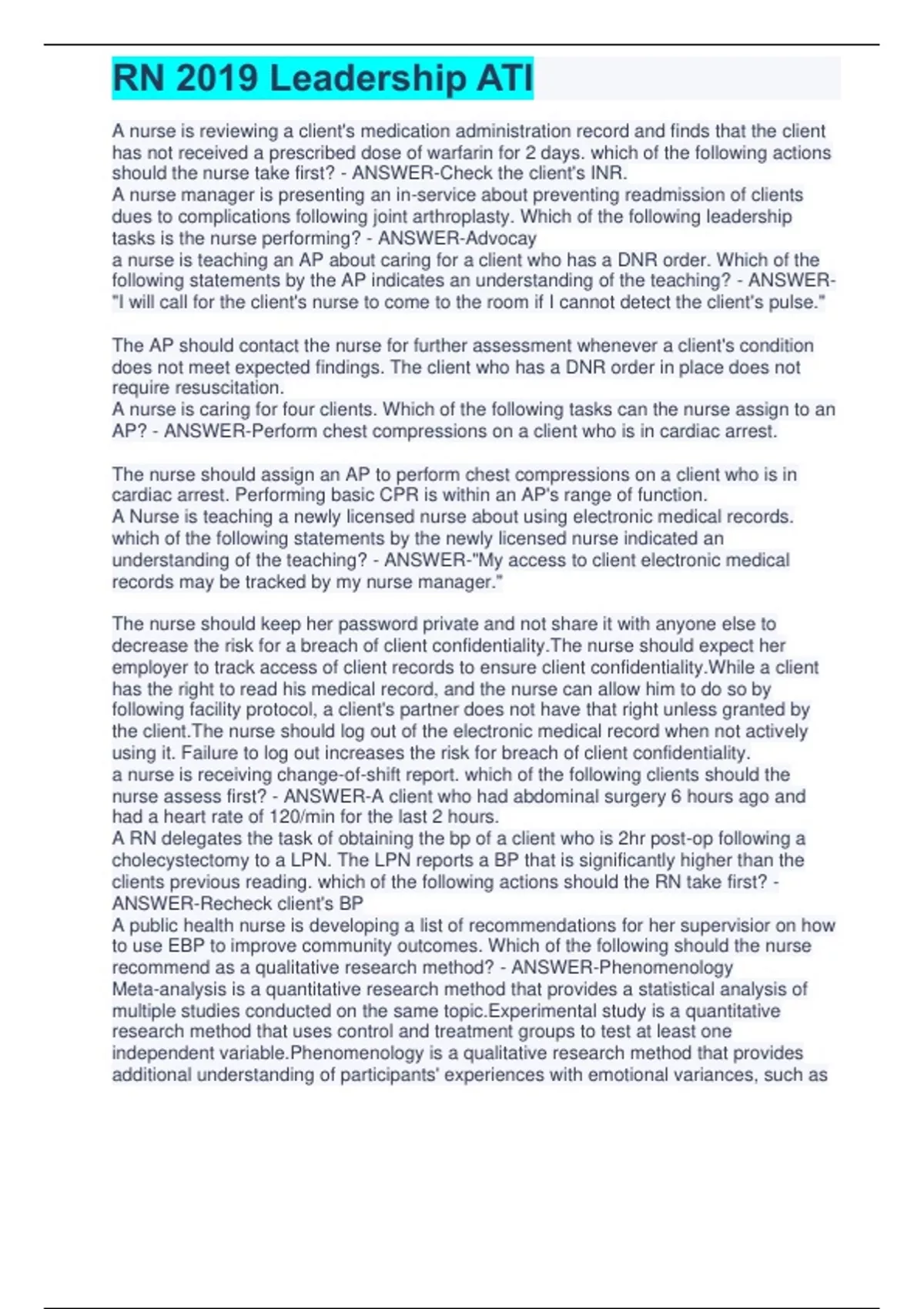RN 2019 Leadership ATI A nurse is reviewing a client's medication administration record and finds that the client has not received a prescribed dose of warfarin for 2 days. which of the following actions should the nurse take first? - ANSWER-Check the client's INR. A nurse manager is presenting an in-service about preventing readmission of clients dues to complications following joint arthroplasty. Which of the following leadership tasks is the nurse performing? - ANSWER-Advocay a nurse is teaching an AP about caring for a client who has a DNR order. Which of the following statements by the AP indicates an understanding of the teaching? - ANSWER-"I will call for the client's nurse to come to the room if I cannot detect the client's pulse." The AP should contact the nurse for further assessment whenever a client's condition does not meet expected findings. The client who has a DNR order in place does not require resuscitation. A nurse is caring for four clients. Which of the following tasks can the nurse assign to an AP? - ANSWER-Perform chest compressions on a client who is in cardiac arrest. The nurse should assign an AP to perform chest compressions on a client who is in cardiac arrest. Performing basic CPR is within an AP's range of function. A Nurse is teaching a newly licensed nurse about using electronic medical records. which of the following statements by the newly licensed nurse indicated an understanding of the teaching? - ANSWER-"My access to client electronic medical records may be tracked by my nurse manager." The nurse should keep her password private and not share it with anyone else to decrease the risk for a breach of client confidentiality.The nurse should expect her employer to track access of client records to ensure client confidentiality.While a client has the right to read his medical record, and the nurse can allow him to do so by following facility protocol, a client's partner does not have that right unless granted by the client.The nurse should log out of the electronic medical record when not actively using it. Failure to log out increases the risk for breach of client confidentiality. a nurse is receiving change-of-shift report. which of the following clients should the nurse assess first? - ANSWER-A client who had abdominal surgery 6 hours ago and had a heart rate of 120/min for the last 2 hours. A RN delegates the task of obtaining the bp of a client who is 2hr post-op following a cholecystectomy to a LPN. The LPN reports a BP that is significantly higher than the clients previous reading. which of the following actions should the RN take first? - ANSWER-Recheck client's BP A public health nurse is developing a list of recommendations for her supervisior on how to use EBP to improve community outcomes. Which of the following should the nurse recommend as a qualitative research method? - ANSWER-Phenomenology Meta-analysis is a quantitative research method that provides a statistical analysis of multiple studies conducted on the same topic.Experimental study is a quantitative research method that uses control and treatment groups to test at least one independent variable.Phenomenology is a qualitative research method that provides additional understanding of participants' experiences with emotional variances, such as RN 2019 Leadership ATI grief and hope.Secondary analysis is a quantitative research method that uses previously collected data to answer newly formed hypotheses. A nurse at a urgent care clinic notices that a pain assessment is not being performed for all clients