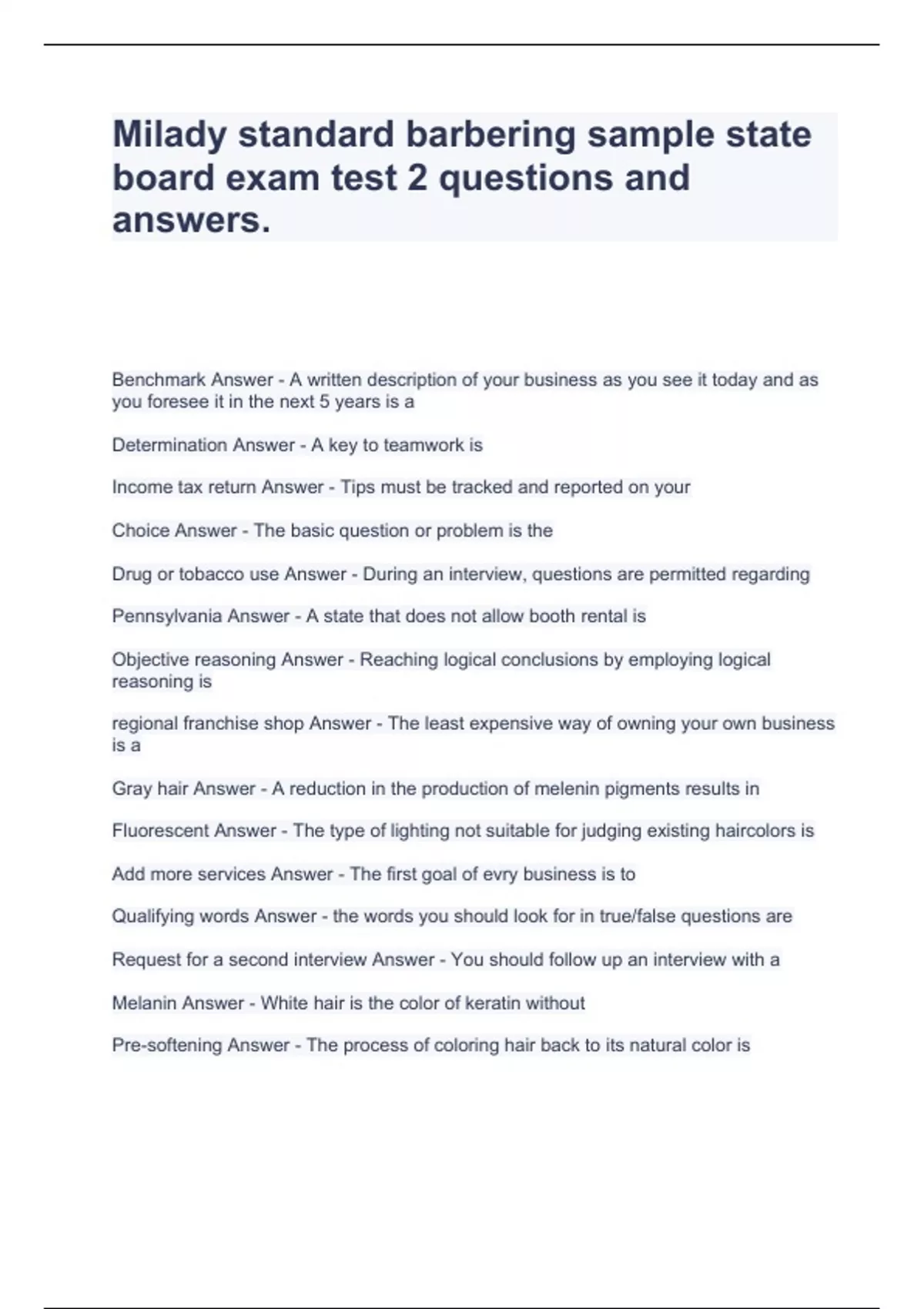 Milady standard barbering sample state board exam test 2 questions and answers