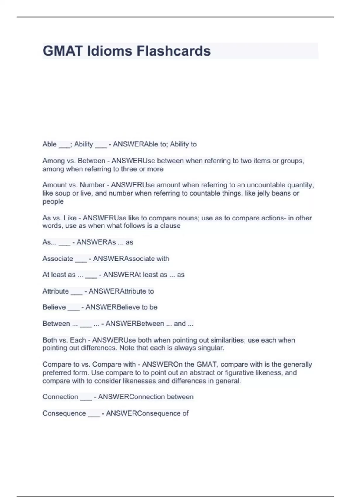 GMAT Idioms Flashcards Exam with solutions