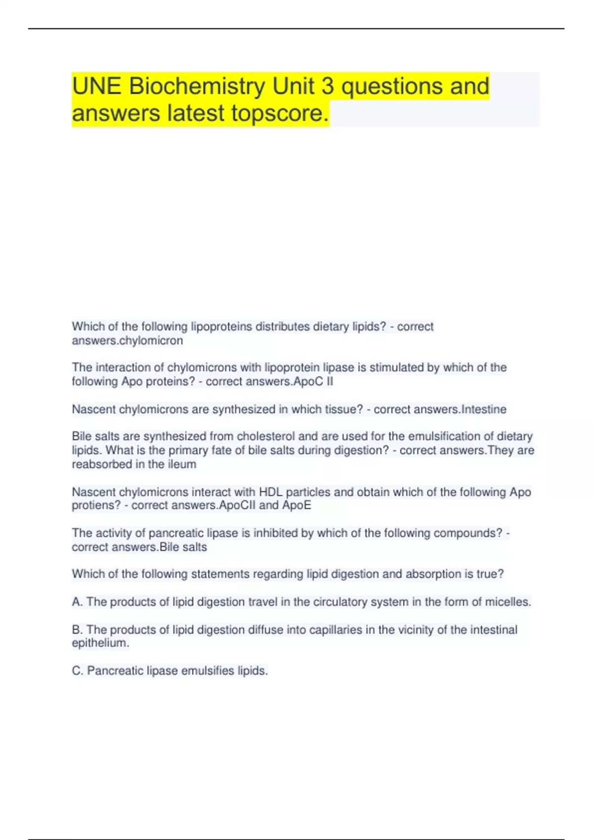 UNE Biochemistry Unit 3 questions and answers latest topscore. Which of the following lipoproteins distributes dietary lipids? - correct micron The interaction of chylomicrons with lipoprotein lipase is stimulated by which of the following Apo proteins? - correct answers.ApoC II Nascent chylomicrons are synthesized in which tissue? - correct answers.Intestine Bile salts are synthesized from cholesterol and are used for the emulsification of dietary lipids. What is the primary fate of bile salts during digestion? - correct answers.They are reabsorbed in the ileum Nascent chylomicrons interact with HDL particles and obtain which of the following Apo protiens? - correct answers.ApoCII and ApoE The activity of pancreatic lipase is inhibited by which of the following compounds? - correct answers.Bile salts Which of the following statements regarding lipid digestion and absorption is true? A. The products of lipid digestion travel in the circulatory system in the form of micelles. B. The products of lipid digestion diffuse into capillaries in the vicinity of the intestinal epithelium. C. Pancreatic lipase emulsifies lipids. D. The products of lipid digestion are resynthesized into triacylglycerols in intestinal epithelial cells. E. In the absence of bile salts, no digestion of lipids would occur. - correct answers.The products of lipid digestion are resynthesized into triacylglycerols in intestinal epithelial cells. Under fasting conditions (Ratio of insulin to glucagon 1), elevated glucagon will activate which of the following enzymes? - correct answers.Hormone sensitive lipase VLDL particles are characterized by which of the following apoproteins? - correct answers.Apo B 100 An increase in insulin leads to which of the following metabolic shifts? - correct answers.Acetyl CoA carboxylase will become dephosphorylated and active Biotin is a cofactor required for which of the following enzymes? - correct answers.A and B (Acetyl CoA carboxylase and Pyruvate carboxylase) The first step in fatty acid synthesis is the formation of ________ from acetyl CoA and carbon dioxide. - correct yl CoA Insulin increases the activity of all of the following enzymes except: - correct answers.Hormone sensitive lipase Which of the following is the regulatory enzyme for fatty acid synthesis? - correct answers.AcetylCo A carboxylase Which of the following is the regulated step of fatty acid synthesis in eukaryotes? A. Carboxylation of acetyl CoA B. Transportation of mitochondrial acetyl CoA into the cytosol C. Assembly of the fatty acid chain D. All of the above - correct answers.Carboxylation of acetyl CoA Under conditions of starvation, all of the following are true except: A. the brain will preferentially be oxidizing ketones B. hormone sensitive lipase will be phosphorylated C. AMP kinase will be active