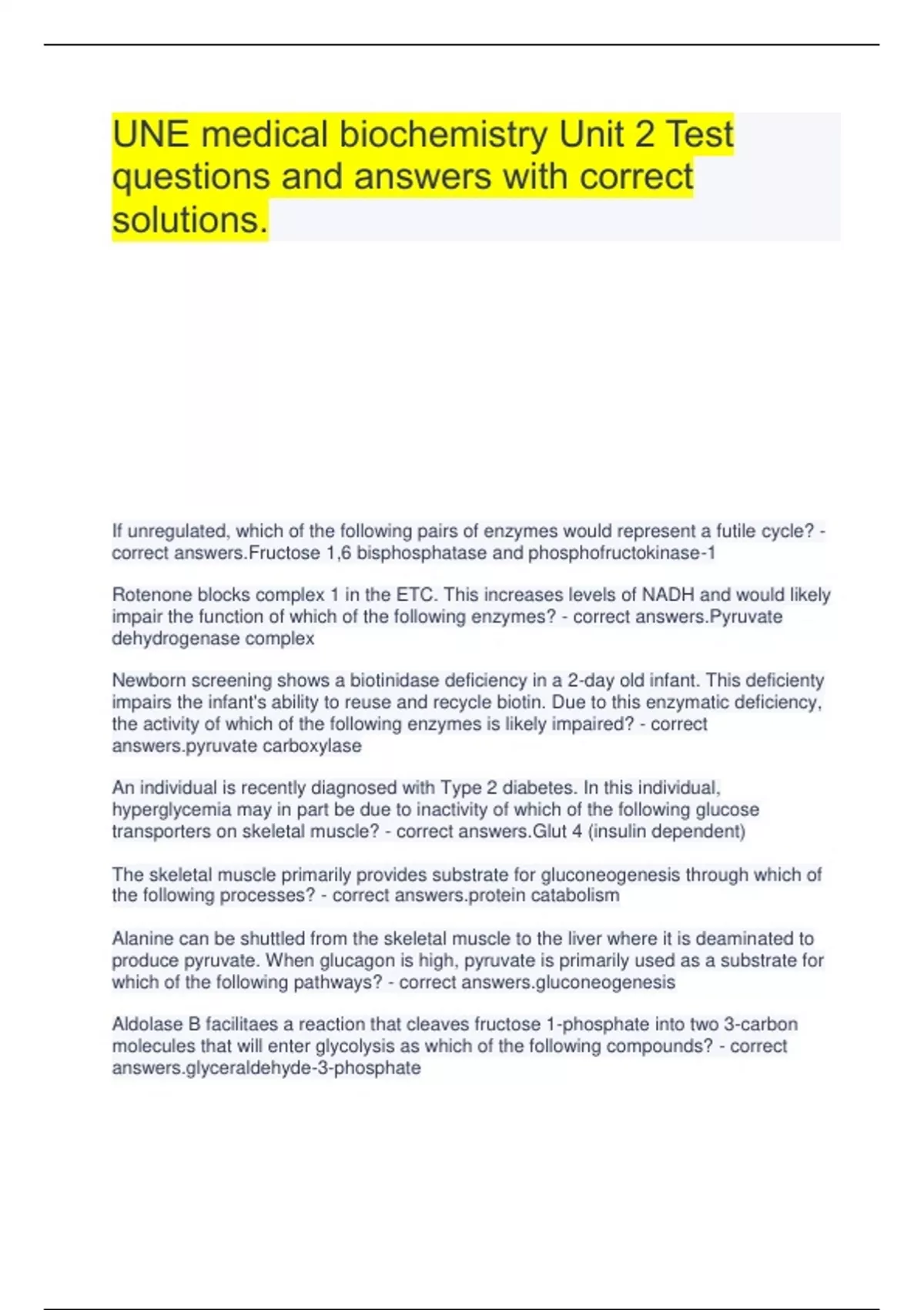 UNE medical biochemistry Unit 2 Test questions and answers with correct solutions. If unregulated, which of the following pairs of enzymes would represent a futile cycle? - correct answers.Fructose 1,6 bisphosphatase and phosphofructokinase-1 Rotenone blocks complex 1 in the ETC. This increases levels of NADH and would likely impair the function of which of the following enzymes? - correct answers.Pyruvate dehydrogenase complex Newborn screening shows a biotinidase deficiency in a 2-day old infant. This deficienty impairs the infant's ability to reuse and recycle biotin. Due to this enzymatic deficiency, the activity of which of the following enzymes is likely impaired? - correct ate carboxylase An individual is recently diagnosed with Type 2 diabetes. In this individual, hyperglycemia may in part be due to inactivity of which of the following glucose transporters on skeletal muscle? - correct answers.Glut 4 (insulin dependent) The skeletal muscle primarily provides substrate for gluconeogenesis through which of the following processes? - correct in catabolism Alanine can be shuttled from the skeletal muscle to the liver where it is deaminated to produce pyruvate. When glucagon is high, pyruvate is primarily used as a substrate for which of the following pathways? - correct neogenesis Aldolase B facilitaes a reaction that cleaves fructose 1-phosphate into two 3-carbon molecules that will enter glycolysis as which of the following compounds? - correct raldehyde-3-phosphate