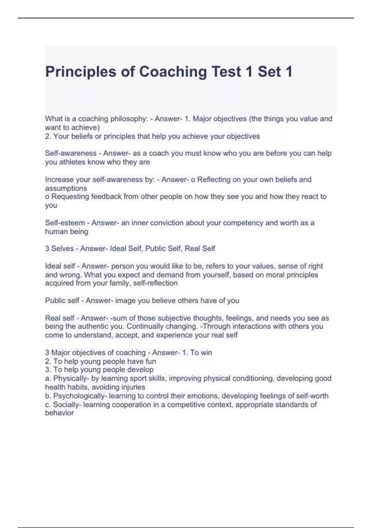 Principles of Coaching Test 1 Set 1 Questions and Answers