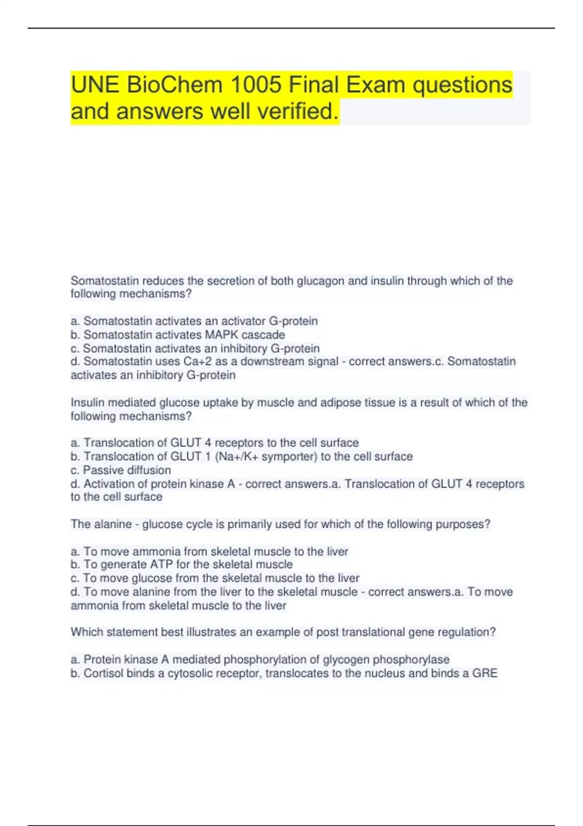 UNE BioChem 1005 Final Exam questions and answers well verified. Somatostatin reduces the secretion of both glucagon and insulin through which of the following mechanisms? a. Somatostatin activates an activator G-protein b. Somatostatin activates MAPK cascade c. Somatostatin activates an inhibitory G-protein d. Somatostatin uses Ca+2 as a downstream signal - correct answers.c. Somatostatin activates an inhibitory G-protein Insulin mediated glucose uptake by muscle and adipose tissue is a result of which of the following mechanisms? a. Translocation of GLUT 4 receptors to the cell surface b. Translocation of GLUT 1 (Na+/K+ symporter) to the cell surface c. Passive diffusion d. Activation of protein kinase A - correct answers.a. Translocation of GLUT 4 receptors to the cell surface The alanine - glucose cycle is primarily used for which of the following purposes? a. To move ammonia from skeletal muscle to the liver b. To generate ATP for the skeletal muscle c. To move glucose from the skeletal muscle to the liver d. To move alanine from the liver to the skeletal muscle - correct answers.a. To move ammonia from skeletal muscle to the liver Which statement best illustrates an example of post translational gene regulation? a. Protein kinase A mediated phosphorylation of glycogen phosphorylase b. Cortisol binds a cytosolic receptor, translocates to the nucleus and binds a GRE c. Iron binding the iron response elements binding protein (IRE_BP) allowing for translation of ferritin mRNA d. DNA histone associations leading to super-coiling of DNA - correct answers.a. Protein kinase A mediated phosphorylation of glycogen phosphorylase Which of the following hormones is released from the liver in response to increased levels of growth hormone? a. Cortisol b. Thyroid hormone c. Somatostatin d. Insulin-like growth factor (IGF) - correct answers.d. Insulin-like growth factor (IGF) Autophagy is process involves degradation of protein. Under conditions of high energy (HIGH ATP) which of the following is true regarding regulation of this process? a. Akt is inactive b. AMPK is actice and phosphorylates TSC1/TSC2 Complex c. mTOR is activated d. Rheb is bound to GDP - correct answers.c. mTOR is activated Synthesis of which of the following lipoproteins would be elevated after a carbohydrate rich meal? a. HDL b. Chylomicrons c. LDL d. VLDL - correct answers.d. VLDL The synthesis of N-acetylglutamate (NAGS) is required for the activity of the urea cycle. This compound stimulates the activity of which of the following enzymes? a. Arginase b. Carbamoyl phosphate synthetase I (CPSI) c. Ornithine transcarbamoylase d. Carbamoyl phosphate synthetase II (CPSII) - correct answers.b. Carbamoyl phosphate synthetase I (CPSI) A male infant starts to show signs of lethargy rapidly after birth. Upon evaluation he is determined to have a deficiency in n-acetylglutamate synthesis. Based on this information, which of the following would consistent with this diagnosis? a. Elevated levels of arginine b. Decreased levels of carbamoyl phosphate c. Decreased levels of ammonia