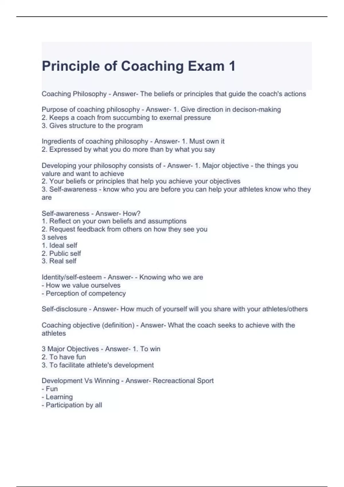 Principle of Coaching Exam 1 Questions and Answers -Graded A