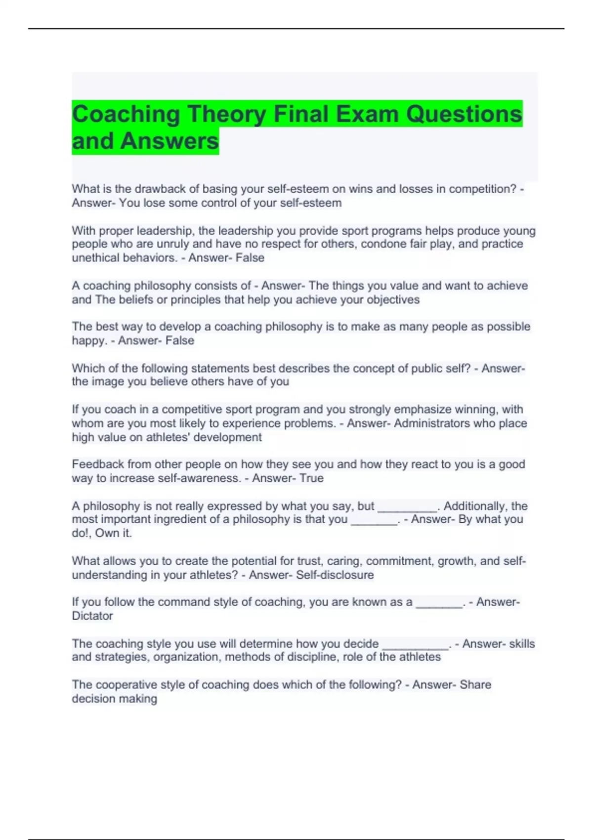 Coaching Theory Final Exam Questions and Answers