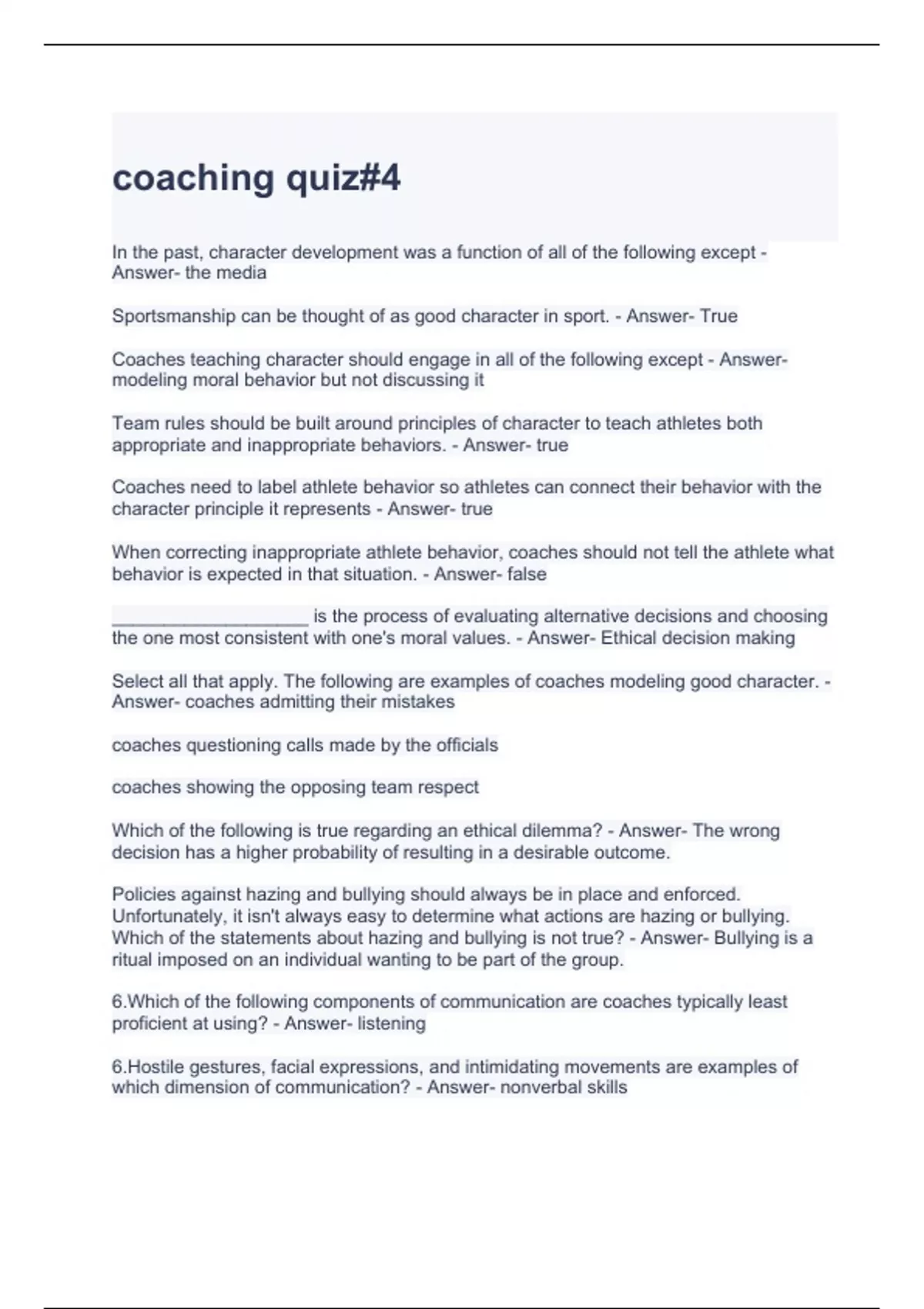 Exam of 6 pages for the course Coaching Principles at Coaching Principles (coaching quiz#4)