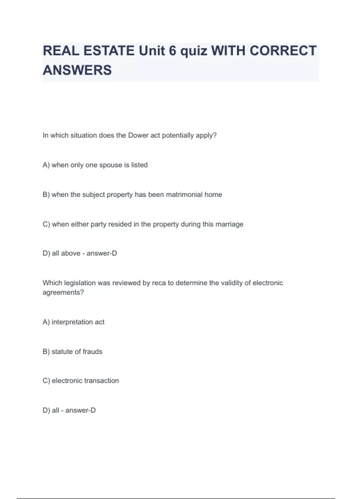- REAL ESTATE Unit 6 quz WITH CORECT ANSWRS