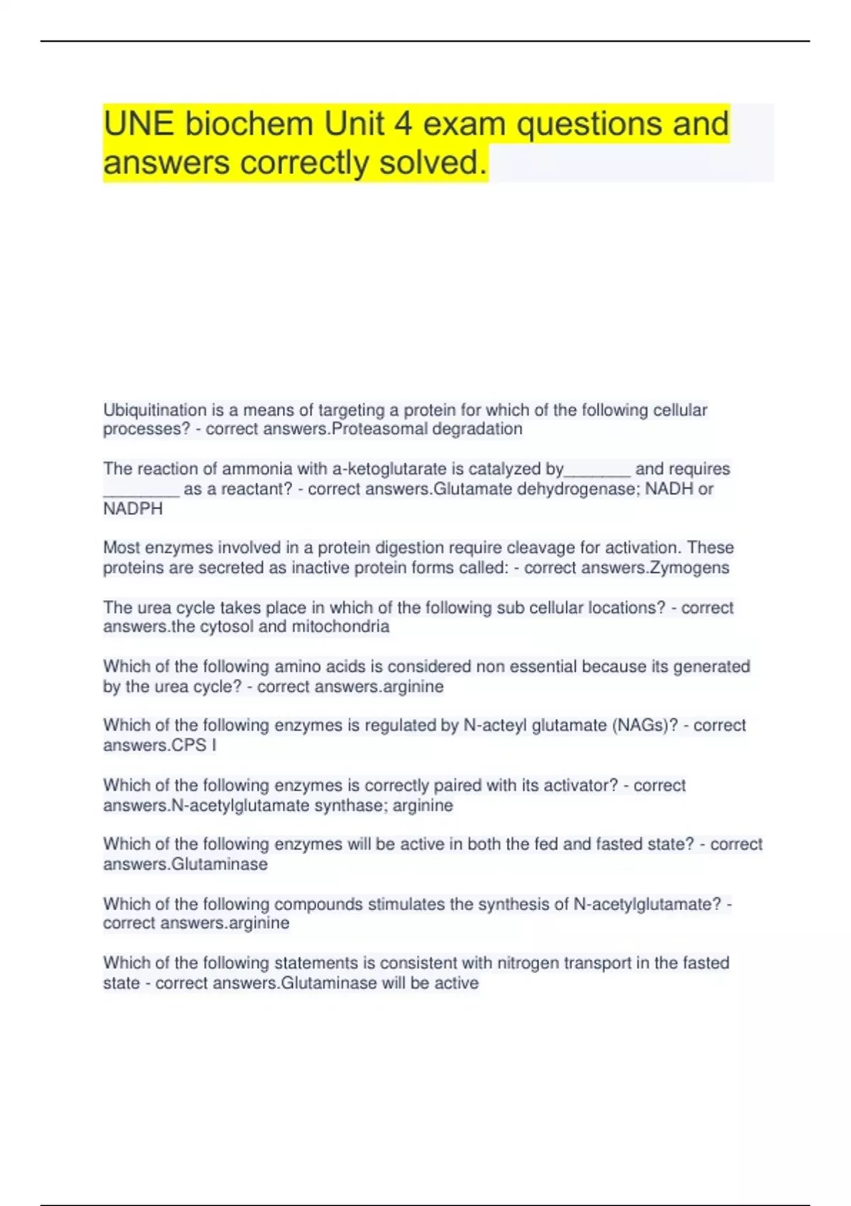 UNE biochem Unit 4 exam questions and answers correctly solved. Ubiquitination is a means of targeting a protein for which of the following cellular processes? - correct answers.Proteasomal degradation The reaction of ammonia with a-ketoglutarate is catalyzed by_______ and requires ________ as a reactant? - correct answers.Glutamate dehydrogenase; NADH or NADPH Most enzymes involved in a protein digestion require cleavage for activation. These proteins are secreted as inactive protein forms called: - correct answers.Zymogens The urea cycle takes place in which of the following sub cellular locations? - correct cytosol and mitochondria Which of the following amino acids is considered non essential because its generated by the urea cycle? - correct ine Which of the following enzymes is regulated by N-acteyl glutamate (NAGs)? - correct answers.CPS I Which of the following enzymes is correctly paired with its activator? - correct answers.N-acetylglutamate synthase; arginine Which of the following enzymes will be active in both the fed and fasted state? - correct answers.Glutaminase Which of the following compounds stimulates the synthesis of N-acetylglutamate? - correct ine Which of the following statements is consistent with nitrogen transport in the fasted state - correct answers.Glutaminase will be active