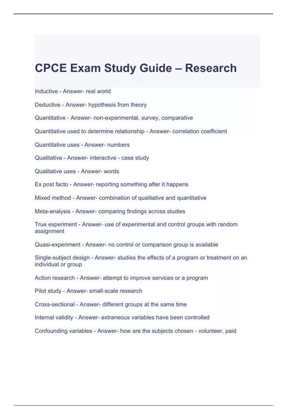 CPCE Exam Study Guide - Research with complete solutions