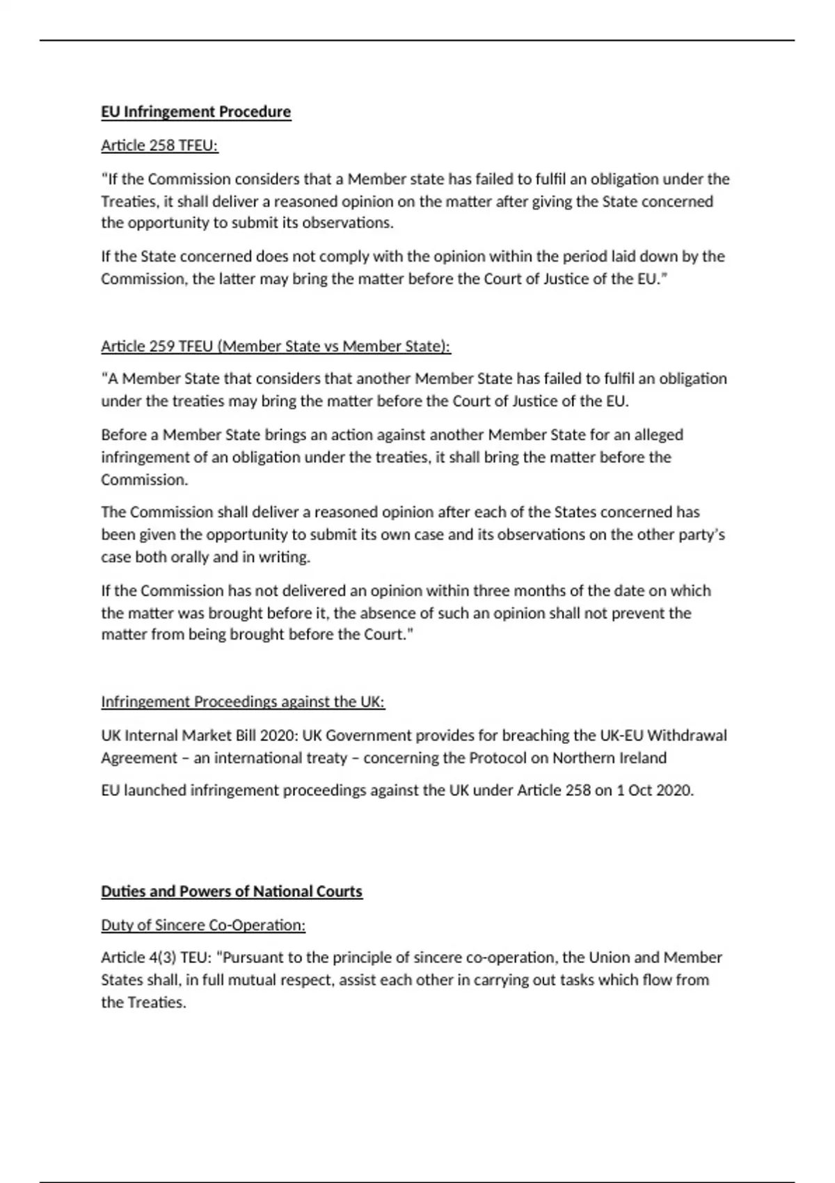Notes summary on EU infringement procedure