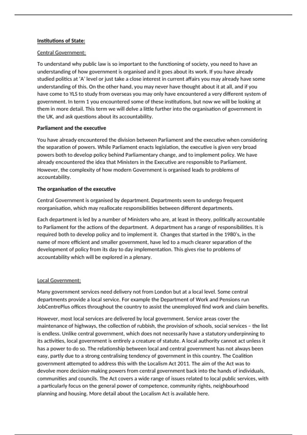 Summary notes on the public law topic of institutions of state