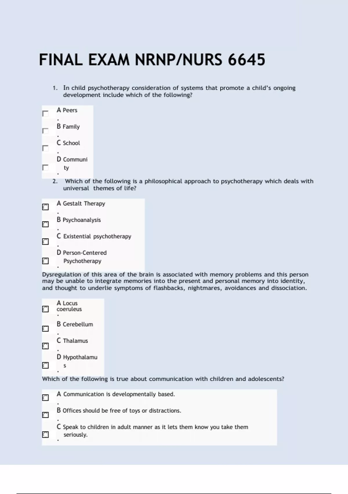This document contains the most recent and verified questions and answers for the NRNP/NURS 6645 Final Exam, focusing on advanced psychotherapy, psychopharmacology, and mental health treatment planning. It aligns with the current Walden University PMHNP curriculum and covers essential clinical concepts, therapeutic modalities, case studies, and evidence-based interventions. Ideal for psychiatric nurse practitioner students preparing for the NRNP/NURS 6645 final assessment. FINAL EXAM NRNP/NURS 6645 1. In child psychotherapy consideration of systems that promote a child’s ongoing development include which of the following? 2. Which of the following is a philosophical approach to psychotherapy which deals with universal themes of life?NRNP/NURS 6645 FINAL EXAM WITH CORRECT ANSWERS LATEST EDITIONNRNP/NURS 6645 FINAL EXAM WITH CORRECT ANSWERS LATEST EDITIONNRNP/NURS 6645 FINAL EXAM WITH CORRECT ANSWERS LATEST EDITIONNRNP/NURS 6645 FINAL EXAM WITH CORRECT ANSWERS LATEST EDITIONNRNP/NURS 6645 FINAL EXAM WITH CORRECT ANSWERS LATEST EDITIONNRNP/NURS 6645 FINAL EXAM WITH CORRECT ANSWERS LATEST EDITIONNRNP/NURS 6645 FINAL EXAM WITH CORRECT ANSWERS LATEST EDITIONNRNP/NURS 6645 FINAL EXAM WITH CORRECT ANSWERS LATEST EDITIONNRNP/NURS 6645 FINAL EXAM WITH CORRECT ANSWERS LATEST EDITIONNRNP/NURS 6645 FINAL EXAM WITH CORRECT ANSWERS LATEST EDITIONNRNP/NURS 6645 FINAL EXAM WITH CORRECT ANSWERS LATEST EDITIONNRNP/NURS 6645 FINAL EXAM WITH CORRECT ANSWERS LATEST EDITIONNRNP/NURS 6645 FINAL EXAM WITH CORRECT ANSWERS LATEST EDITIONNRNP/NURS 6645 FINAL EXAM WITH CORRECT ANSWERS LATEST EDITIONNRNP/NURS 6645 FINAL EXAM WITH CORRECT ANSWERS LATEST EDITIONNRNP/NURS 6645 FINAL EXAM WITH CORRECT ANSWERS LATEST EDITIONNRNP/NURS 6645 FINAL EXAM WITH CORRECT ANSWERS LATEST EDITIONNRNP/NURS 6645 FINAL EXAM WITH CORRECT ANSWERS LATEST EDITIONNRNP/NURS 6645 FINAL EXAM WITH CORRECT ANSWERS LATEST EDITIONNRNP/NURS 6645 FINAL EXAM WITH CORRECT ANSWERS LATEST EDITIONNRNP/NURS 6645 FINAL EXAM WITH CORRECT ANSWERS LATEST EDITIONNRNP/NURS 6645 FINAL EXAM WITH CORRECT ANSWERS LATEST EDITIONNRNP/NURS 6645 FINAL EXAM WITH CORRECT ANSWERS LATEST EDITIONNRNP/NURS 6645 FINAL EXAM WITH CORRECT ANSWERS LATEST EDITIONNRNP/NURS 6645 FINAL EXAM WITH CORRECT ANSWERS LATEST EDITIONNRNP/NURS 6645 FINAL EXAM WITH CORRECT ANSWERS LATEST EDITIONNRNP/NURS 6645 FINAL EXAM WITH CORRECT ANSWERS LATEST EDITIONNRNP/NURS 6645 FINAL EXAM WITH CORRECT ANSWERS LATEST EDITIONNRNP/NURS 6645 FINAL EXAM WITH CORRECT ANSWERS LATEST EDITIONNRNP/NURS 6645 FINAL EXAM WITH CORRECT ANSWERS LATEST EDITIONNRNP/NURS 6645 FINAL EXAM WITH CORRECT ANSWERS LATEST EDITIONNRNP/NURS 6645 FINAL EXAM WITH CORRECT ANSWERS LATEST EDITIONNRNP/NURS 6645 FINAL EXAM WITH CORRECT ANSWERS LATEST EDITIONNRNP/NURS 6645 FINAL EXAM WITH CORRECT ANSWERS LATEST EDITIONNRNP/NURS 6645 FINAL EXAM WITH CORRECT ANSWERS LATEST EDITIONNRNP/NURS 6645 FINAL EXAM WITH CORRECT ANSWERS LATEST EDITIONNRNP/NURS 6645 FINAL EXAM WITH CORRECT ANSWERS LATEST EDITIONNRNP/NURS 6645 FINAL EXAM WITH CORRECT ANSWERS LATEST EDITIONNRNP/NURS 6645 FINAL EXAM WITH CORRECT ANSWERS LATEST EDITIONNRNP/NURS 6645 FINAL EXAM WITH CORRECT ANSWERS LATEST EDITIONNRNP/NURS 6645 FINAL EXAM WITH CORRECT ANSWERS LATEST EDITIONNRNP/NURS 6645 FINAL EXAM WITH CORRECT ANSWERS LATEST EDITIONNRNP/NURS 6645 FINAL EXAM WITH CORRECT ANSWERS LATEST EDITIONNRNP/NURS 6645 FINAL EXAM WITH CORRECT ANSWERS LATEST EDITIONNRNP/NURS 6645 FINAL EXAM WITH CORRECT ANSWERS LATEST EDITIONNRNP/NURS 6645 FINAL EXAM WITH CORRECT ANSWERS LATEST EDITIONNRNP/NURS 6645 FINAL EXAM WITH CORRECT ANSWERS LATEST EDITIONNRNP/NURS 6645 FINAL EXAM WITH CORRECT ANSWERS LATEST EDITIONNRNP/NURS 6645 FINAL EXAM WITH CORRECT ANSWERS LATEST EDITIONNRNP/NURS 6645 FINAL EXAM WITH CORRECT ANSWERS LATEST EDITIONNRNP/NURS 6645 FINAL EXAM WITH CORRECT ANSWERS LATEST EDITIONNRNP/NURS 6645 FINAL EXAM WITH CORRECT ANSWERS LATEST EDITIONNRNP/NURS 6645 FINAL EXAM WITH CORRECT ANSWERS LATEST EDITIONNRNP/NURS 6645 FINAL EXAM WITH CORRECT ANSWERS LATEST EDITIONNRNP/NURS 6645 FINAL EXAM WITH CORRECT ANSWERS LATEST EDITIONNRNP/NURS 6645 FINAL EXAM WITH CORRECT ANSWERS LATEST EDITIONNRNP/NURS 6645 FINAL EXAM WITH CORRECT ANSWERS LATEST EDITION